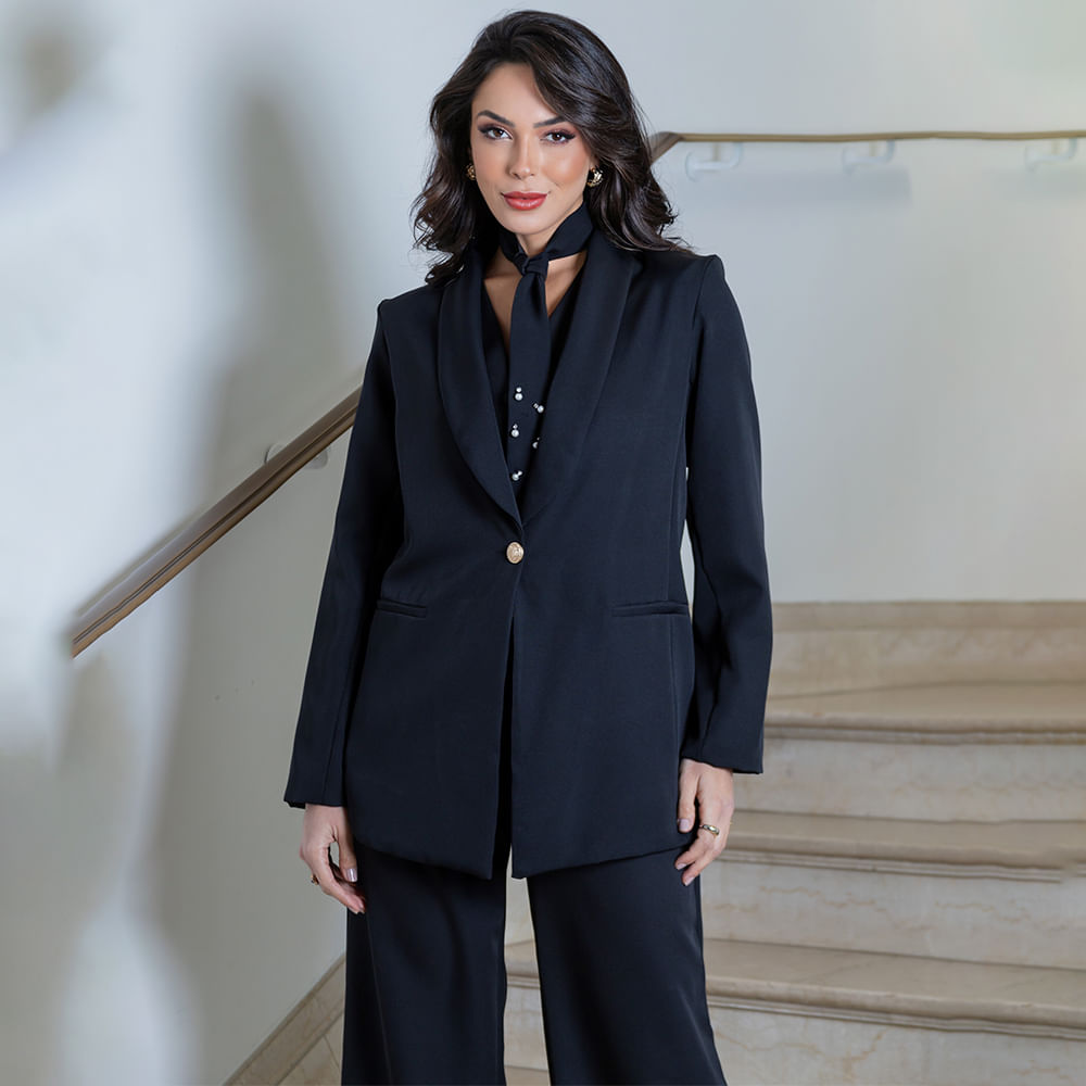 O blazer de alfaiataria com botões se destaca como uma peça que combina sofisticação, versatilidade e um toque de autoridade; Esta tendência contemporânea abraça a atemporalidade da alfaiataria, adicionando um toque moderno através de detalhes meticulosamente escolhidos; O blazer de alfaiataria feminino é conhecido por sua estrutura impecável, que incorpora linhas nítidas e um caimento perfeito; A adição de botões é um elemento chave que não só proporciona funcionalidade, mas também acrescenta um aspecto estiloso à peça; Pode ser usado como uma peça formal, tornando-se uma declaração de elegância quando combinado com uma saia lápis ou calças de alfaiataria; Mas também se encaixa perfeitamente em um ambiente casual, quando usado com jeans e uma camiseta, adicionando uma dose de sofisticação a um look descontraído; <br>.<br><br>Produto: Blazer Alfaiataria Botões Preto <br>Categoria: Blazer<br>Cor: Preto <br>Manga: Longa<br>Gola: Gola Camisa<br>Tecido: Alfaiataria<br>Composição: 95% Poliester/ 5% Elastano<br>Peso : 300g<br>Gênero: Feminino<br>Marca: Vértice<br><br>Medidas da Modelo<br>Altura: 1,75 cm<br>Busto: 83 cm<br>Cintura: 67 cm<br>Quadril: 100 cm<br>A MODELO VESTE O TAMANHO P<br>.<br>Medidas.<br>P - Busto até 90 cm l Cintura até 71 cm l Quadril até 99 Cm.<br>M - Busto até 96 cm l Cintura até 77 cm l Quadril até 102 cm.<br>G - Busto até 102 cm l Cintura 83 cm l Quadril 111 cm.<br>GG - Busto 108 cm l Cintura até 89 cm l Quadril até 117 cm.<br>EGG - Busto até 114 cm l Cintura até 95 cm l Quadril até 123 cm.<br> <br> <br> <br> <br> <br> <br> <br> <br> <br> <br>