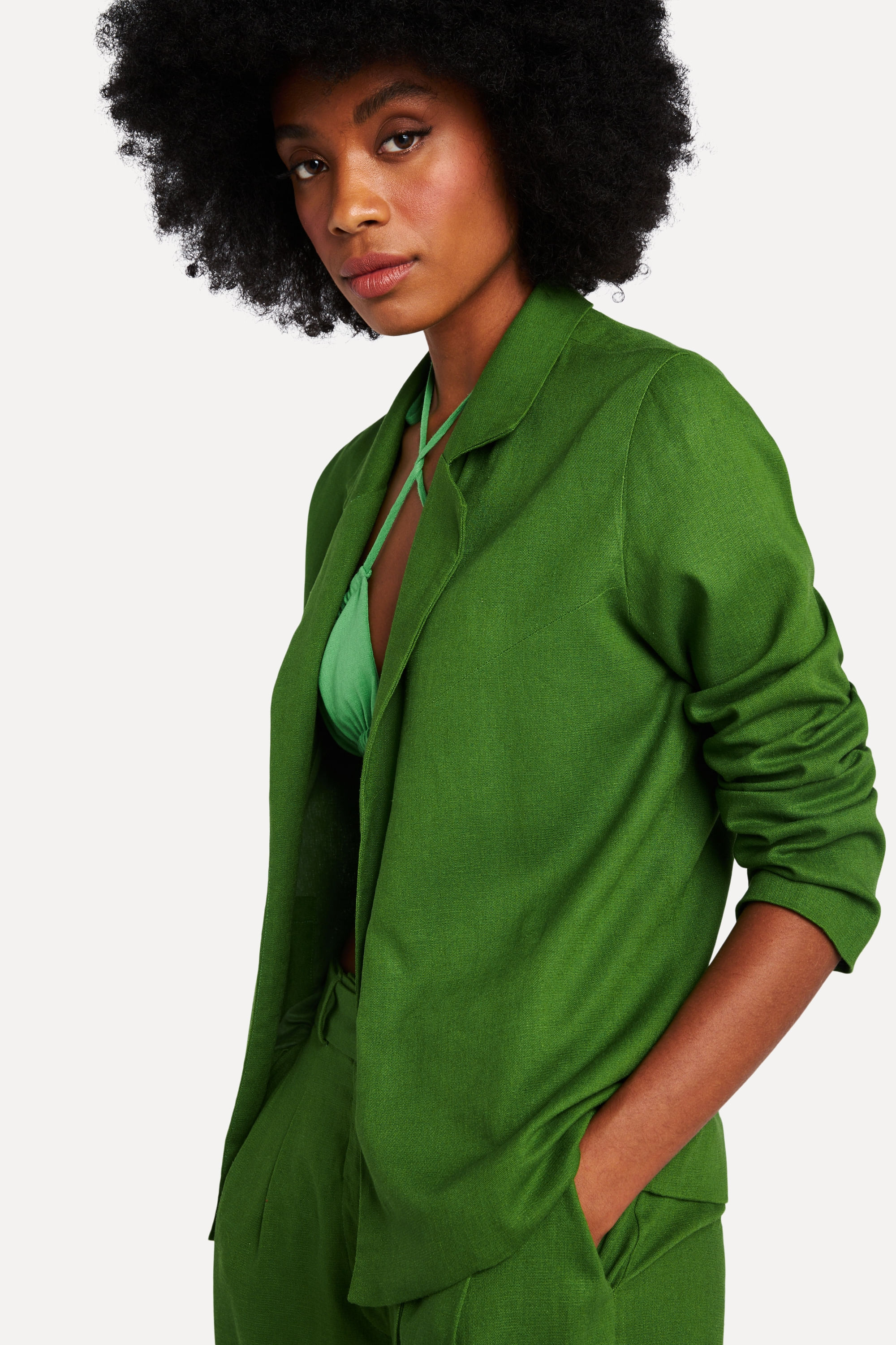 O blazer de alfaiataria é de <b>linho</b>, tem modelagem ampla, <b>oversized</b>, e é uma peça super durável e resistente. Sobreposição perfeita para dar mais cor para seu look casual.