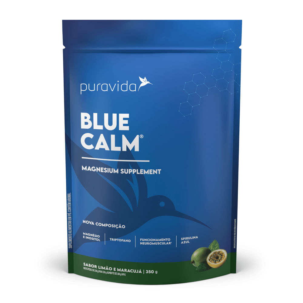 <p dir="ltr">O <strong>Blue Calm sabor limão e maracujá da Puravida</strong> é uma bebida funcional que tem como principal componente o magnésio bisglicinato, além de mio-inositol, taurina e triptofano. Conta também com um Blend® exclusivo de ingredientes, resultando em uma opção saborosa para o consumo diário.</p>_x000D_ <h2 dir="ltr">Sobre os ingredientes:</h2>_x000D_ <p dir="ltr"><strong>Magnésio:</strong> mineral super importante para diversas reações metabólicas no corpo. Atua na saúde de ossos e dentes, funcionamento muscular e relaxamento, contribui para a saúde cognitiva e intestinal e melhora da qualidade do sono. </p>_x000D_ <p dir="ltr"><strong>Taurina:</strong> taurina é um aminoácido, que no cérebro é responsável por aumentar os níveis de GABA, neurotransmissor que promove o relaxamento e a calma.</p>_x000D_ <p dir="ltr"><strong>Triptofano:</strong> o L-triptofano é um aminoácido, precursor da serotonina e melatonina. Desta forma, pode contribuir na melhora do bem-estar e relaxamento. </p>_x000D_ <h2 dir="ltr">Sugestão de consumo:</h2>_x000D_ <p dir="ltr">Diluir um scoop (7g) em 100ml de água quente e consumir, preferencialmente, antes de dormir ou conforme recomendação do médico ou nutricionista. </p>_x000D_ <h2 dir="ltr">Motivos para escolher o produto:</h2>_x000D_ <ul>_x000D_ <li dir="ltr" aria-level="1">_x000D_ <p dir="ltr" role="presentation">250 mg de magnésio; </p>_x000D_ </li>_x000D_ <li dir="ltr" aria-level="1">_x000D_ <p dir="ltr" role="presentation">Magnésio em sua forma biodisponível, para melhor absorção;</p>_x000D_ </li>_x000D_ <li dir="ltr" aria-level="1">_x000D_ <p dir="ltr" role="presentation">Rende 50 porções;</p>_x000D_ </li>_x000D_ <li dir="ltr" aria-level="1">_x000D_ <p dir="ltr" role="presentation">Elaborado com chá de camomila, chá de maracujá, espirulina azul, lavanda e limão em pó;</p>_x000D_ </li>_x000D_ <li dir="ltr" aria-level="1">_x000D_ <p dir="ltr" role="presentation">Sem corantes, conservantes e aromatizantes artificiais; </p>_x000D_ </li>_x000D_ <li dir="ltr" aria-level="1">_x000D_ <p dir="ltr" role="presentation">Zero adição de açúcares;</p>_x000D_ </li>_x000D_ <li dir="ltr" aria-level="1">_x000D_ <p dir="ltr" role="presentation">Adoçado naturalmente com stévia; </p>_x000D_ </li>_x000D_ <li dir="ltr" aria-level="1">_x000D_ <p dir="ltr" role="presentation">Sem glúten e sem lactose.</p>_x000D_ </li>_x000D_ </ul>_x000D_ <h2 dir="ltr">A Marca</h2>_x000D_ <p dir="ltr"><strong>Puravida </strong>é uma empresa que nasceu com o propósito de facilitar a prática de um estilo de vida orgânico. Acreditam que a qualidade daquilo que escolhemos comer, pode afetar o funcionamento do nosso corpo, funcionamento dos órgãos, humor, foco e mente. Através de suas vitaminas, suplementos, cosméticos, granolas, colágenos e outros produtos elaborados com ingredientes de altíssima qualidade podem contribuir com a sinergia do corpo.</p>