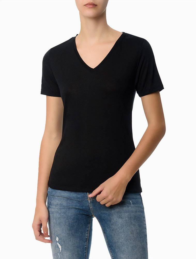 Descubra novos looks com a blusa feminina estampa bordada em surton gola V off white Calvin Klein Jeans. A peça tem tecido viscotricot e modelo certo ao corpo, com manga curta, decote em V e estampa localizada no peito.