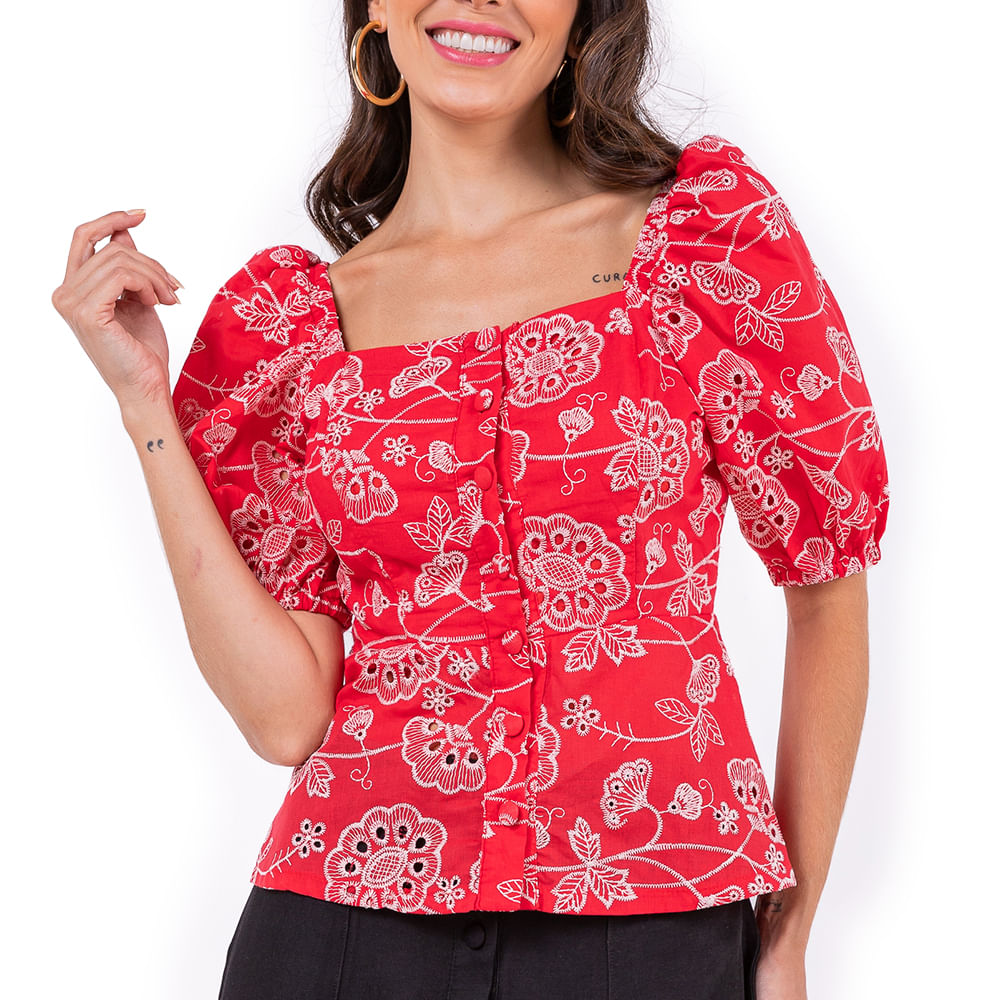 Blusa feminina confeccionada em tecido de laise, com bordados florais, trazendo delicadeza a peça; Modelo conta com decote quadrado, mangas bufantes com elástico, fechamento frontal por botões e cintura marcada; A blusa feminina em laise é uma peça romântica e ideal para usar em ocasiões que pedem leveza e feminilidade; Aposte com saia midi em tecidos fluidos ou short de alfaiataria em linho e arremate com sandálias de fibras naturais; Os tecidos com toque natural e com detalhes feito á mão são a aposta da temporada, e a blusa em laise com mangas bufantes sem dúvidas é a it peça para um visual tendência; Aposte!<br><br><br>.<br><br>Produto: Blusa Laise Manga Bufante Vermelho <br>Categoria: Blusas<br>Cor: Vermelho <br>Manga: Manga 3/4<br>Gola: Gola Quadrada <br>Tecido: Laise Poa<br>Composição : 20% Poliester/ 80% algodao<br>Peso :200 g<br>Gênero: Feminino<br>Marca: Vértice<br><br>Medidas.<br><br><br>P - Busto até 90 cm l Cintura até 71 cm l Quadril até 99 Cm.<br>M - Busto até 96 cm l Cintura até 77 cm l Quadril até 102 cm.<br>G - Busto até 102 cm l Cintura 83 cm l Quadril 111 cm.<br>GG - Busto 108 cm l Cintura até 89 cm l Quadril até 117 cm.<br>EGG - Busto até 114 cm l Cintura até 95 cm l Quadril até 123 cm.<br><br><br><br><br><br><br><br><br><br><br><br><br><br><br><br><br><br><br><br><br><br><br><br><br><br><br><br><br><br><br><br><br><br><br><br>