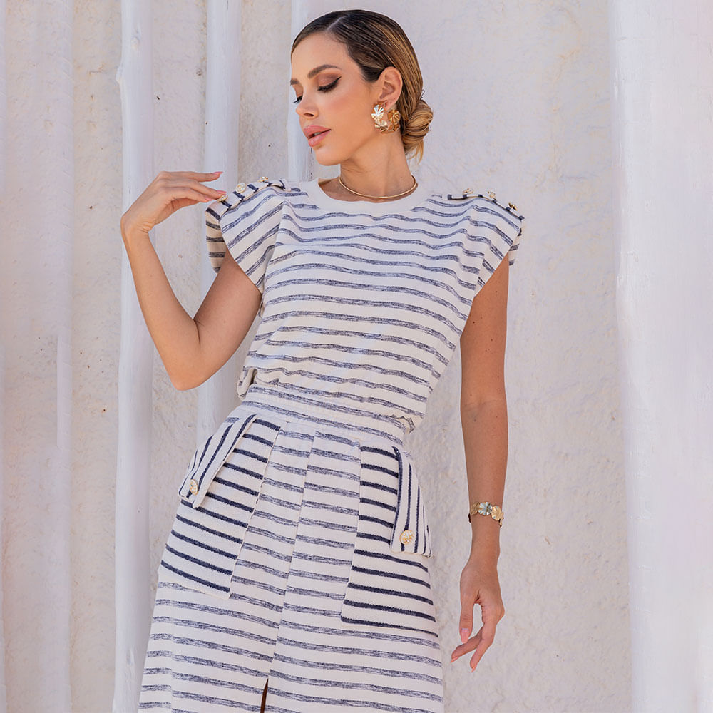Prepare-se para abraçar o conforto e a sofisticação com esta regata muscle tee excepcionalmente estilosa; Feita a partir de um luxuoso tecido atoalhado de algodão, esta peça é a combinação perfeita de maciez e estilo; O padrão de listras off white e marinho, habilmente entrelaçado no tecido, empresta um toque clássico e atemporal à regata; As listras proporcionam uma sensação de elegância sutil, enquanto o contraste entre os tons off white e marinho oferece um visual equilibrado e atraente; O que torna esta regata verdadeiramente única são os detalhes cuidadosamente colocados nos ombros; Botões brancos e dourados, elegantes e de bom gosto, adicionam um toque de sofisticação e caráter à peça; Combinar uma regata muscle tee de tecido atoalhado de algodão com listras off white e marinho e botões brancos e dourados nos ombros pode resultar em looks elegantes e descontraídos ao mesmo tempo; Para um Look Casual Chic; Combine a regata muscle tee com uma saia midi plissada em uma cor neutra, como preto ou branco; Adicione um cinto fino na cintura para um toque de elegância; Use sandálias de tiras ou sapatilhas para manter o visual casual; Para um Visual Náutico Moderno; Use a regata com uma saia lápis em azul-marinho; Acrescente um cinto largo de corda para um toque náutico; Complemente o look com espadrilles ou sapatilhas listradas; Uma tendência de moda atual para a regata muscle são os Padrões de Listras, as listras marinho e off white estão alinhadas com o estilo náutico clássico; Para aprimorar a tendência náutica, adicione acessórios inspirados no mar, como brincos de âncora, pulseiras de corda ou um lenço com padrão de âncora; Opte por sapatos estilo espadrille em marinho ou dourado, que são uma escolha clássica e confortável para esse tema; Um chapéu de palha estilo capitãoou um chapéu de abas largas pode adicionar um toque extra de sofisticação náutica ao seu look; <br>.<br>Produto: Blusa Muscle Listrada Botoões Marinho <br>Categoria: Blusa<br>Cor: Marinho <br>Tecido: Algodão<br>Composição: 90% Algodão/10% Poliester<br>Peso : 300g<br>Gênero: Feminino<br>Marca: Vértice<br><br>Medidas da Modelo<br>Altura: 1,74 cm<br>Busto: 85 cm<br>Cintura: 68 cm<br>Quadril: 101cm<br>A MODELO VESTE O TAMANHO P<br>.<br>Medidas.<br>P - Busto até 90 cm l Cintura até 71 cm l Quadril até 99 Cm.<br>M - Busto até 96 cm l Cintura até 77 cm l Quadril até 102 cm.<br>G - Busto até 102 cm l Cintura 83 cm l Quadril 111 cm.<br>GG - Busto 108 cm l Cintura até 89 cm l Quadril até 117 cm.<br>EGG - Busto até 114 cm l Cintura até 95 cm l Quadril até 123 cm.<br><br><br><br><br><br><br><br><br><br><br><br><br><br><br><br>