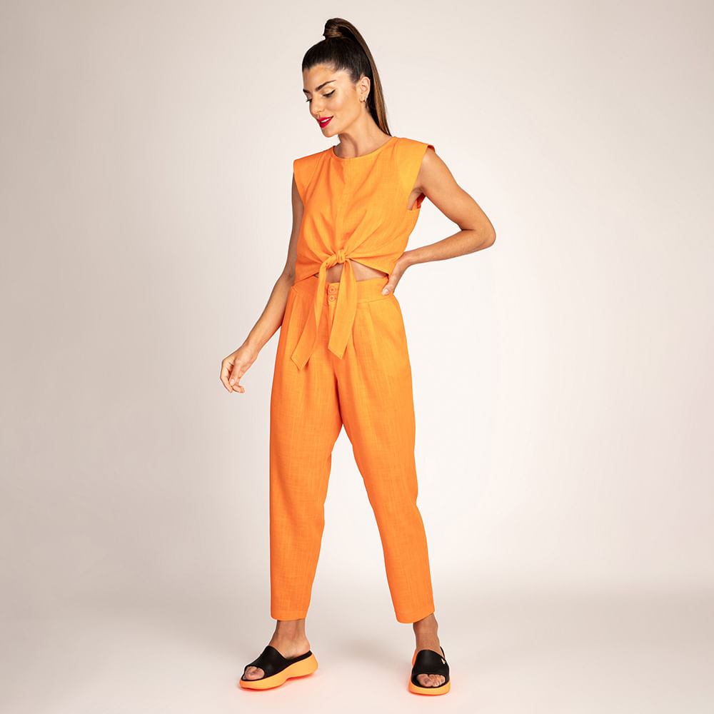 A Blusa Musclee Amarração tem amarração na frente com manga curta tecido confortável, pra você que quer uma peça cheia de estilo com muito conforto ela é perfeita.<br>A Blusa Musclee é uma peça muito versátil ,ela pode ser usada tanto em um office look como em looks mais despojados ,para o trabalho use peças com a cintura alta ,como saias e calças de alfaiataria que deixam o visual mais formal mas sem deixar de ser moderno ,abuse dos sapatos de salto do bico fino e mules para deixar seu look mais elegante ,já para um visual mais casual ela fica perfeita com jeans como ambas são peças mais básicas invista nos acessórios como mais colar brincos ,se optar por um modelo mais reto pode usar com tênis ,saia os modelos Midi com tecidos leves e soltos trazem delicadeza a combinação ,caso queira um ar mais divertido coloque um tênis branco seja qual for sua escolha você vai arrasar.<br>Este modelo de blusa Musclee é inspirada nos anos 1980, nessa década as roupas fitness eram utilizadas como itens fashion e não somente como item de conforto .<br><br><br>.<br>Produto : Blusa Muscle Amarração Laranja<br>Categoria: Blusas.<br>Cor: Laranja <br>Manga: Curta.<br>Gola: Redonda <br>Tecido: Linho<br>Composição : 80% Viscose 20% Linho<br>Peso :200 g<br>Gênero: Feminino.<br>Marca: Vértice Medidas. P - Busto até 90 cm l Cintura até 71 cm l Quadril até 99 Cm. M - Busto até 96 cm l Cintura até 77 cm l Quadril até 102 cm. G - Busto até 102 cm l Cintura 83 cm l Quadril 111 cm. GG - Busto 108 cm l Cintura até 89 cm l Quadril até 117 cm. EGG - Busto até 114 cm l Cintura até 95 cm l Quadril até 123 cm.