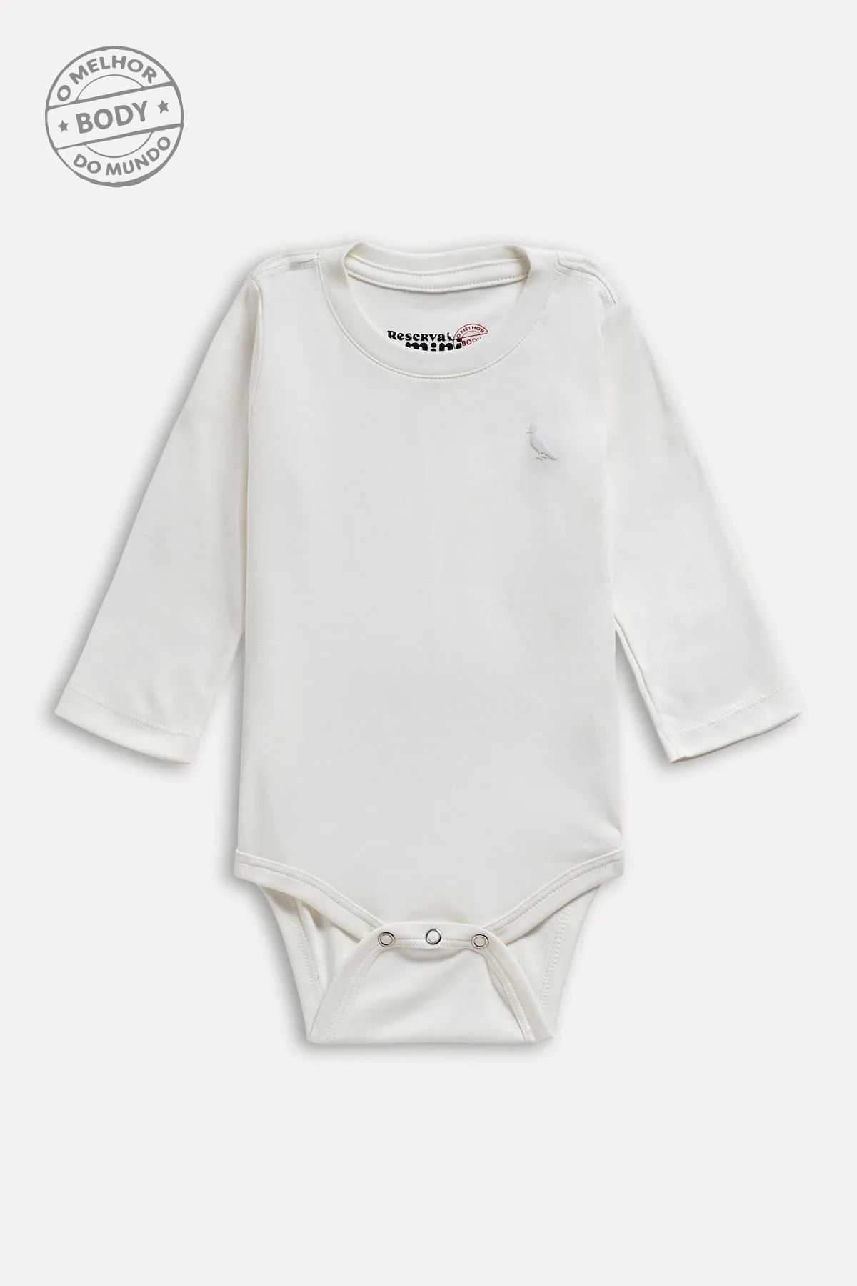 Esse é o melhor body do mundo, feito em malha pima peruana 100% algodão e toque muito macio. Body de manga longa, decote redondo e abotoamento embaixo para vestir. Um body bem quentinho para o bebê com assinatura de pica-pau em silk de relevo tom sobre tom. Produzido eticamente no Brasil. Comprando esta peça, você complementa cinco pratos de comida através do nosso programa 1P=5P.