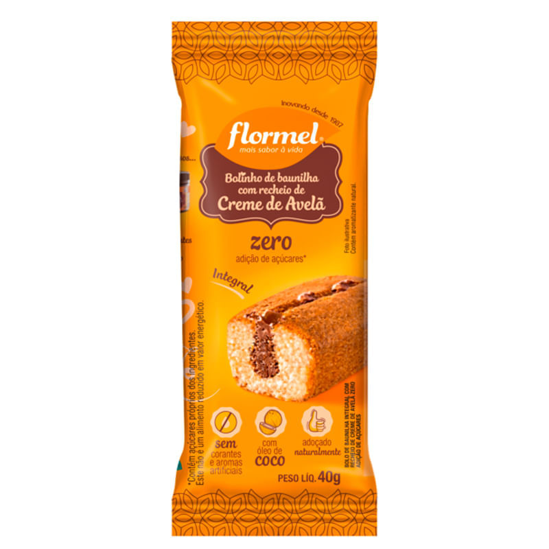 Informações técnicas:<br> Bolinho integral, 40g, Flormel, bolinho de baunillha recheado com creme de avelã, sem adição de açúcar, adoçado com taumatina, o que permite que pessoas com dieta restrita de açúcar possa consumi-lo. Fofinho, muito saboroso.<br> <br> Recomendação de consumo:<br> O produto pode ser consumido a qualquer hora do dia, uma opção para adoçar as refeições intermediárias.<br> <br> Porque escolher esse produto?<br> Sem gordura trans<br> Produzido com óleo de coco<br> Feito com produto integral