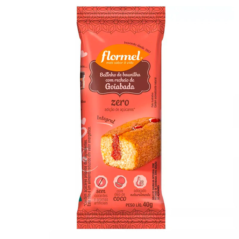 Informações técnicas:<br> Bolinho integral, 40g, Flormel, bolinho feito sem adição de açúcar, com ingrediente integral e recheio de goiabada. Super fofinho, muito gostoso, e uma ótima opção para pessoas com dietas restrita de açúcar.<br> <br> Recomendação de consumo:<br> O produto pode ser consumido a qualquer horário do dia, até mesmo como opções de lanches saudável.<br> <br> Porque escolher esse produto?<br> Sem gordura trans<br> Produzido com óleo de coco<br> Adoçado com taumatina