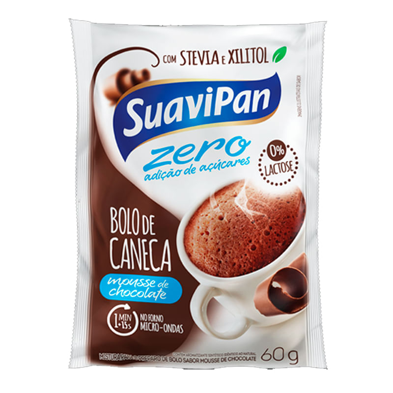 <p><strong>O</strong><strong> Bolo de Caneca Zero açúcar, Mousse de Chocolate</strong><strong>, da</strong><strong> Suavipan</strong><strong>, </strong>é uma mistura para o preparo de bolo de caneca sem açúcar. Versátil e prático, precisa de apenas 5 colheres de água e aproximadamente 1 minuto no micro-ondas. É rico em fibras e adoçado com stévia e xilitol.</p> <strong>Alérgicos:</strong> <p>Contém derivados de trigo e de ovo. Pode conter centeio, cevada, aveia e soja. Contém glúten.</p> <strong>Recomendação de consumo:</strong> <p>Misture o conteúdo do pacote com 5 colheres de sopa de água e leve ao micro-ondas por 1 minuto e 15 segundos.</p> <strong>Por que escolher esse produto?</strong> <ul> <li>Sem adição de açúcar</li> <li>Fácil preparo</li> <li>Sem lactose</li> <li>Rico em fibras</li> <li>Porção individual</li> <li>Adoçado com stevia e xilitol</li> </ul> <strong>Sobre a marca:</strong> <p></p> <p>A Suavipan foi fundada na cidade de São Paulo em 1998 e, desde então, se empenha em desenvolver e fabricar os melhores e mais saudáveis alimentos em sua categoria. Para isso, trabalha com as mais seletas matérias-primas. Possuem quatro linhas distintas de produtos, comercializadas em todo o Brasil, a linha zero adição de açúcares, a de produtos orgânicos, de produtos Integrais e a linha LevSlim.</p>