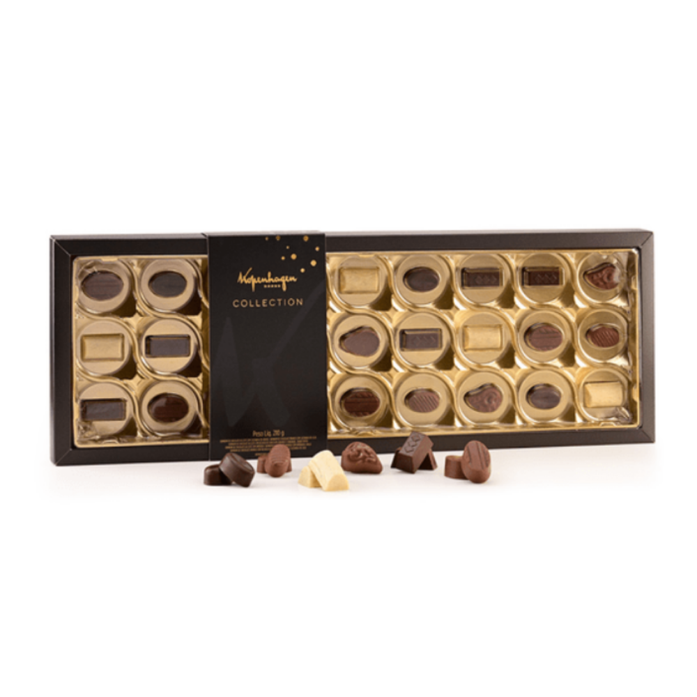 Bombons Kopenhagen Collection 210gNa Bombons Collection, você encontra 6 tipos deliciosos de bombons para experimentar! São eles: Chocolate ao leite com amêndoas, Chocolate ao leite com castanhas do Pará, Chocolate ao leite com recheio de chocolate amargo e conhaque sabor toffee, Chocolate amargo com amêndoas e avelãs, Chocolate branco com castanha-de-caju, Chocolate amargo recheado com gianduia, conhaque e castanha-de-caju. Escolha seu favorito!Aproveite para comprar os Bombons Kopenhagen Collection 210g com entrega rápida e segura.