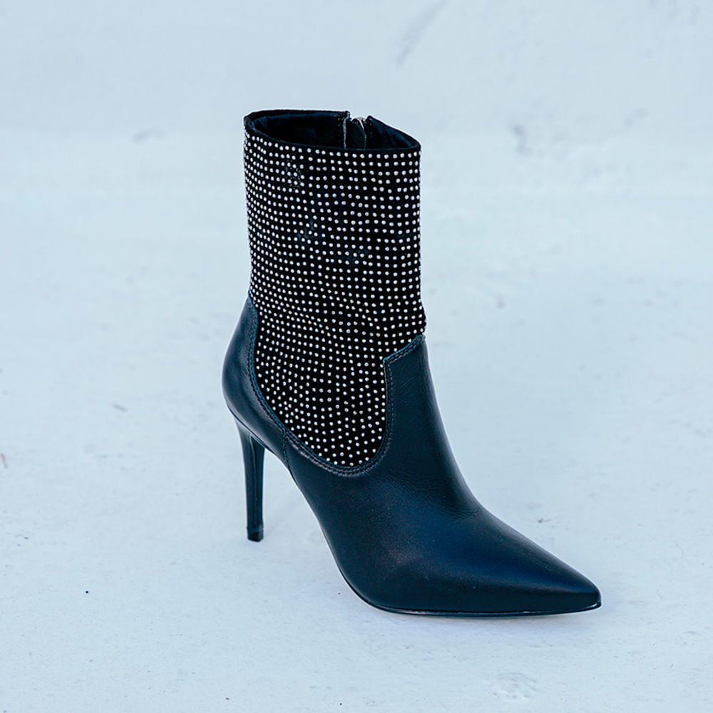 Bota feminina confeccionada em couro e forro sintético; Modelo clássico de salto agulha com 9,5 cm de altura; Possui bico fino, cano médio, solado em PVC que traz maior durabilidade e forro confortável; Acabamento com strass em todo o cano; A bota de salto agulha com strass é ideal para quem adora um visual elaborado.; Combine com um vestido com brilho e arremate com as nossas bolsas metalizadas, para um visual noturno; A bota com strass é perfeita para você garantir o night look digno de uma it girl; Invista nesse modelo para completar sua produção de moda!<br><br>.<br><br>Produto: Bota Brilho Salto Fino Bico Fino Preto<br>Categoria: Botas<br>Tipo de Salto: Fino<br>Altura do Salto: 9,5 cm<br>Tipo de Bico: Fino<br>Material Externo: Couro<br>Solado: Pvc<br>Cano: Curto<br>Forma: Normal, utilize a numeração que costuma utilizar<br>Peso: 1,560 g<br>Cor: Preto<br>Gênero: Feminino.