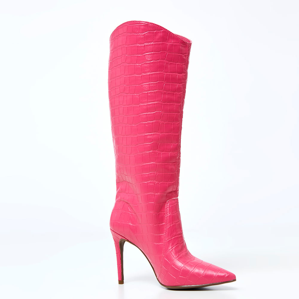 A Bota feminina cano longo salto fino Pink confeccionada em PU. Possui bico levemente afilado e acabamento com textura em croco. Modelo semelhante á modelagem western, com topo do cano arredondado.A bota de cano longo pode ser a protagonista do seu fashion look. Invista em uma produção autêntica combinando sua bota croco com uma calça cropped ou short de modelagem ampla para evidenciar a bota de cano longo, blusa em tons neutros e arremate com uma bolsa do mesmo tom da sua bota feminina.Presente nas produções das fashionistas, o acabamento em croco traz a textura ideal que seu visual precisava. O modelo cano alto deixa seu look imponente trazendo a imagem de autoconfiança, segurança e muito poder, tudo o que as brasileiras amantes da moda desejam.<br>Produto: Bota Cano longo Salto Fino <br>Código do produto: 13150040PIN<br>Categoria: Botas<br>Tipo de Salto: Fino <br>Altura do Salto: 9,5 cm<br>Tipo de Bico: Fino <br>Material Externo: Croco<br>Solado: Pvc<br>Cano: Médio<br>Forma: Menor compre uma numeração maior que a costuma usar <br>Peso: 1,500 g<br>Cor: Pink<br>Gênero: Feminino.