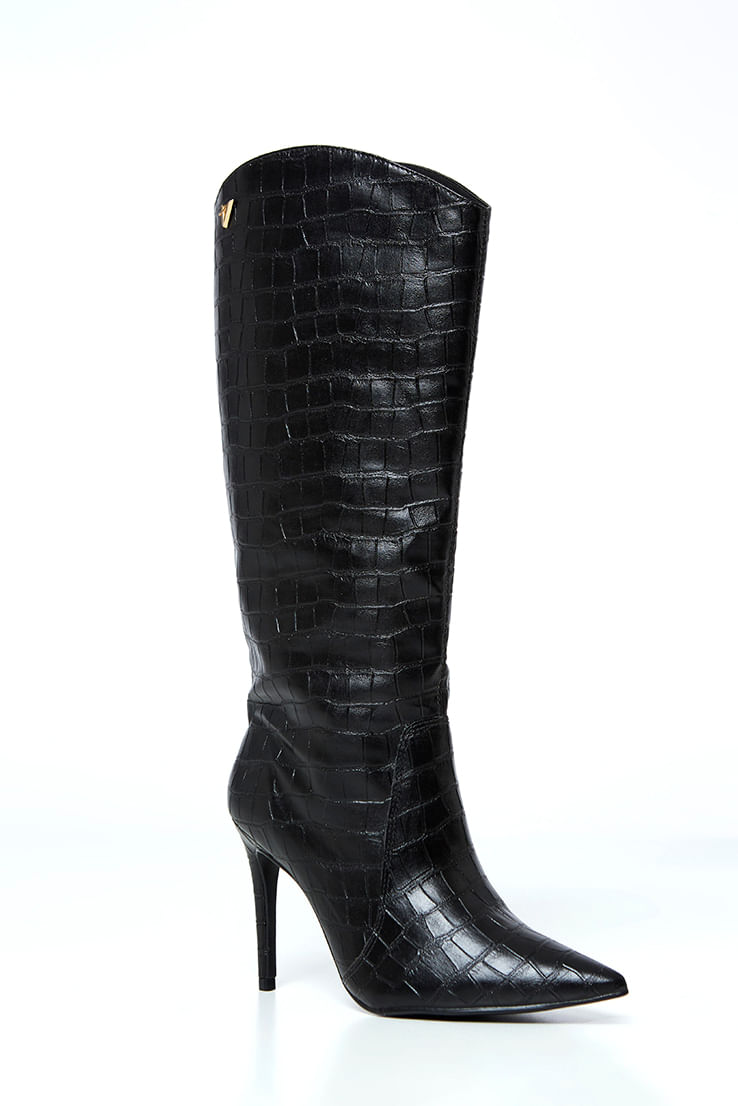 A Bota feminina cano longo salto fino Preto confeccionada em PU. Possui bico levemente afilado e acabamento com textura em croco. Modelo semelhante á modelagem western, com topo do cano arredondado.A bota de cano longo pode ser a protagonista do seu fashion look. Invista em uma produção autêntica combinando sua bota croco com uma calça cropped ou short de modelagem ampla para evidenciar a bota de cano longo, blusa em tons neutros e arremate com uma bolsa do mesmo tom da sua bota feminina.Presente nas produções das fashionistas, o acabamento em croco traz a textura ideal que seu visual precisava. O modelo cano alto deixa seu look imponente trazendo a imagem de autoconfiança, segurança e muito poder, tudo o que as brasileiras amantes da moda desejam.<br>Produto: Bota Cano longo Salto Fino <br>Código do produto: 13150040PRT<br>Categoria: Botas<br>Tipo de Salto: Fino <br>Altura do Salto: 9,5 cm<br>Tipo de Bico: Fino <br>Material Externo: Croco<br>Solado: Pvc<br>Cano: Médio<br>Forma: Menor compre uma numeração maior que a costuma usar <br>Peso: 1,500 g<br>Cor: Preto<br>Gênero: Feminino.