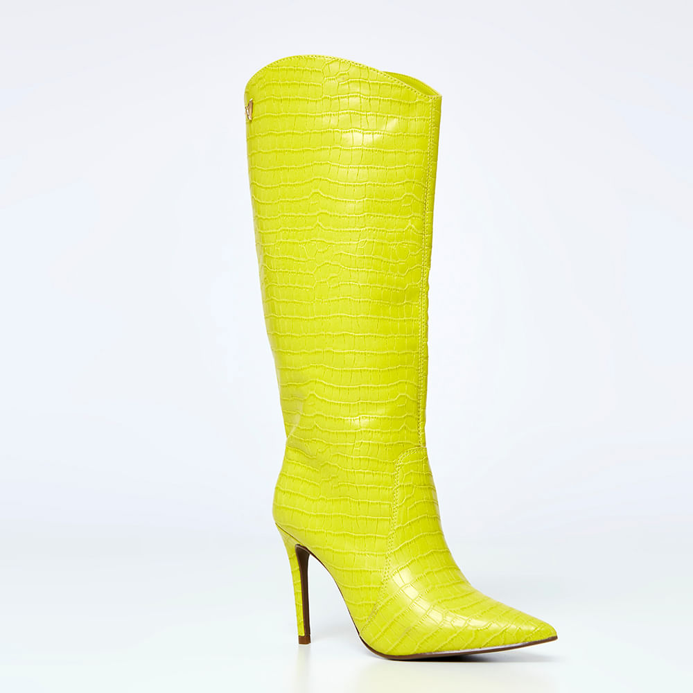A Bota feminina cano longo salto fino Lima confeccionada em material de couro sintético. Possui bico levemente afilado e acabamento com textura em croco. Modelo semelhante á modelagem western, com topo do cano arredondado.A bota de cano longo pode ser a protagonista do seu fashion look. Invista em uma produção autêntica combinando sua bota croco com uma calça cropped ou short de modelagem ampla para evidenciar a bota de cano longo, blusa em tons neutros e arremate com uma bolsa do mesmo tom da sua bota feminina.Presente nas produções das fashionistas, o acabamento em croco traz a textura ideal que seu visual precisava. O modelo cano alto deixa seu look imponente trazendo a imagem de autoconfiança, segurança e muito poder, tudo o que as brasileiras amantes da moda desejam.<br>Produto: Bota Cano longo Salto Fino <br>Código do produto: 13150040LIM<br>Categoria: Botas<br>Tipo de Salto: Fino <br>Altura do Salto: 9,5 cm<br>Tipo de Bico: Fino <br>Material Externo: Croco<br>Solado: Pvc<br>Cano: Médio<br>Forma: Menor compre uma numeração maior que a costuma usar <br>Peso: 1,500 g<br>Cor: Lima<br>Gênero: Feminino.
