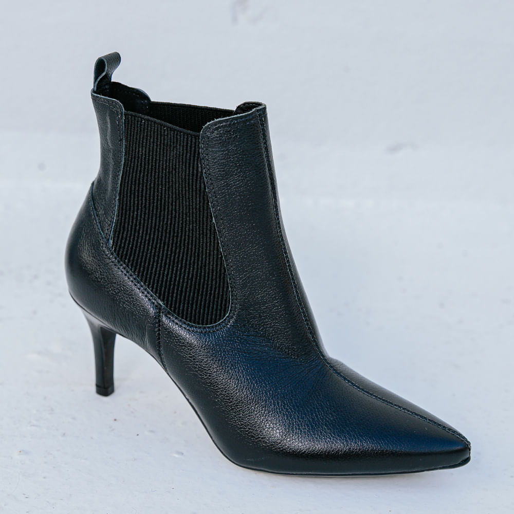 Bota preta feminina confeccionada em couro e forro em cacharrel; Modelo conta com bico fico, salto fino de 7 cm de altura, cano médio com recorte em elástico e puxador posterior; Possui solado resistente e palmilha confortável para os pés; A bota de bico fino traz sofisticação ao look, por isso, vale a pena usar com peças estruturadas; Invista com uma calça pantacourt de alfaiataria e uma muscle tee colorida; Arremate usando nossas bolsas coloridas; Um dos calçados curingas da sapateira das mulheres é a bota de bico fino, por ser sofisticada e empoderada; Aposte na sua e crie os melhores fashion looks da temporada!<br><br><br>.<br><br>Produto : Bota Couro Bico Fino Elastico Preto<br>Categoria: Botas<br>Tipo de Salto: Salto Fino<br>Altura do Salto: 7cm<br>Tipo de Bico: Bico Folha<br>Material Externo: Couro<br>Forro: CACHARREL<br>Solado : PVC<br>Cano : Curto<br>Forma: Normal compre sua numeração que costuma usar<br>Peso: 0,504g<br>Cor: Preto<br>Gênero: Feminino.