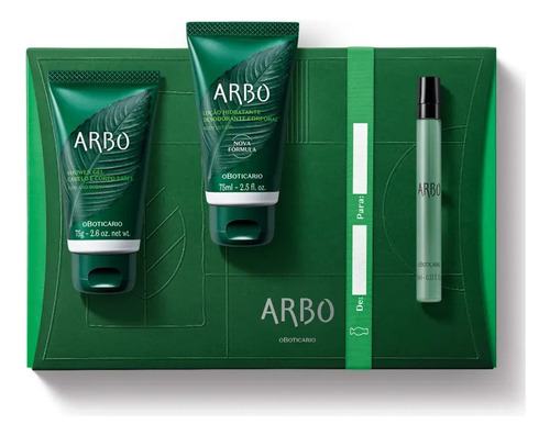 o kit Presente Arbo é o presente completo para quem ama a fragrância leve e fresca de Arbo. Ideal para quem quer se desligar da rotina, esse kit entrega três produtos que não podem faltar em sua rotina de autocuidado. DESODORANTE COLÔNIA Arbo Forest Desodorante Colônia traz uma perfumação que recria e entrega a sensação renovadora e energizante semelhante a um banho de floresta, com uma tecnologia exclusiva que traz os benefícios dos Phyntocides para a fragrância. A versão com 10ml é ideal para carregar na bolsa ou mochila, para você experimentar uma verdadeira imersão na natureza e um despertar para os sentidos. HIDRATANTE CORPORAL A Loção Hidratante Corporal Arbo entrega fragrância e hidratação para sua pele. Com toque aveludado, garante hidratação intensa para sua pele por horas. Além disso, intensifica a fragrância suave e fresca de Arbo. SHOWER GEL O Shower Gel Arbo é a solução para cuidar do corpo e do cabelo de forma rápida. Sua espuma em contato com a pele entrega cremosidade e limpeza na medida certa, sem deixar a pele ressecada. Sua fragrância inconfundível garante um momento de cuidado inconfundível para seus dias. CAIXA PARA PRESENTE O Kit Presente vem em uma embalagem especial de presente com berço de PET, para trazer comodidade e segurança para seus itens, além disso, possui fita decorativa com DE/PARA para encantar em qualquer ocasião. Presenteie com O Boticário! Nenhum produto O Boticário é testado em animais, ou seja, este item possui selo Cruelty Free. O kit contém: 1 Arbo Forest Desodorante Colônia 10ml 1 Loção Hidratante Corporal Arbo 75ml 1 Shower Gel Arbo 75g Família Olfativa: Fougère Fresco.