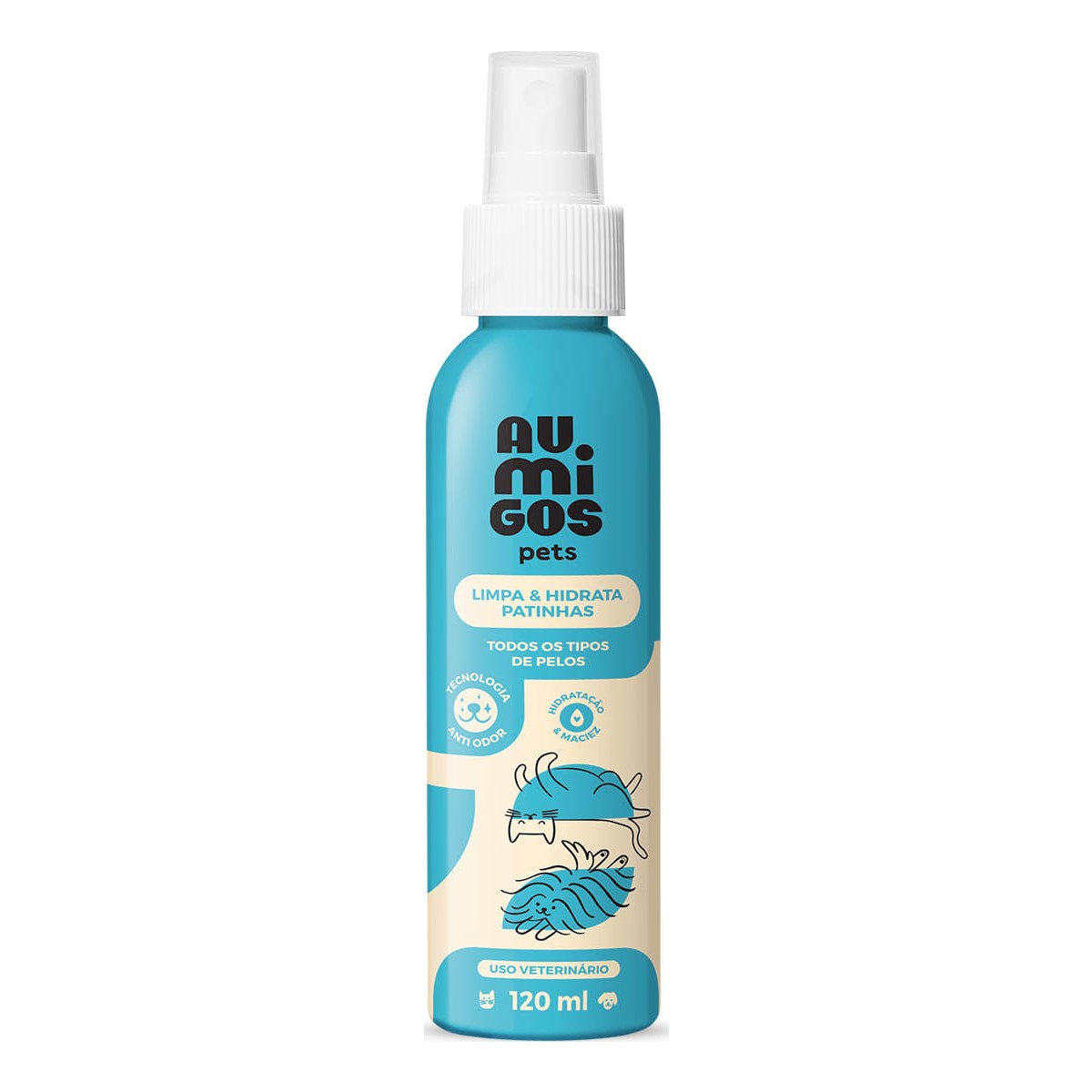 Limpa e Hidrata Patinhas Au.Migos Pets 120ml<br /> O Limpa e Hidrata Patinhas Au.Migos Pets é o produto ideal para cães e gatos, sem a utilização de água. Sua formulação limpa e hidrata, permitindo uma higienização rápida e prática dos coxins, As “almofadinhas” das patas de cachorros e gatos que a gente ama! <br /> <br /> <br /> Criado para a higiene de cães e gatos, permite uma higienização rápida e prática do seu pet. Cabe na bolsa ou mochila e é uma excelente opção para manter as patinhas limpas após o passeio de rua ou nos cuidados do dia a dia.<br /> <br /> <br /> A fragrância deste shampoo pet é um Floral Frutal Cítrico suave, delicado e duradouro,afinal,queremos que eles estejam por toda parte espalhando o cheiro da alegria! Sua formulação contém tecnologia neutralizante de mau odor, que deixará o seu pet mais cheirosinho. Pronto para abraçá-los e enchê-los de beijos!<br /> <br /> <br /> -Para cães e gatos acima de três meses;<br /> <br /> <br /> -Para todos os tipos de pelo;<br /> <br /> <br /> -Não resseca as patinhas;<br /> <br /> <br /> -Proporciona hidratação e maciez;<br /> <br /> <br /> -Elimina o cheirinho de chulé;<br /> <br /> <br /> -Rápida absorção, não deixando escorregadio;<br /> <br /> <br /> -pH balanceado;<br /> <br /> <br /> -Livre de parabenos;<br /> <br /> <br /> -Hidrata os coxins, as ”almofadas” das patinhas.<br /> <br /> <br /> Para garantir a segurança do seu animal de estimação, este produto para pet é especialmente desenvolvido para não agredir a pele, sendo aprovado por veterinários.<br /> <br /> <br /> O resultado? Patas limpas sem usar água. Um cuidado cheio de carinho para esse membro especial que faz parte da sua família.<br />