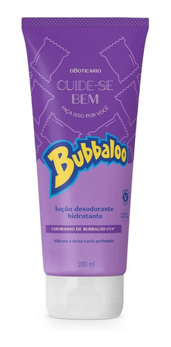Loção Desodorante Hidratante Corporal Cuide-se Bem Uva 200ml. Tem dias que bate uma nostalgia e vontade de voltar no tempo, não é mesmo? Cuide-Se Bem Boticário e Bubbaloo se juntaram em uma edição limitada para fazer você reviver a fase mais divertida da vida, e ainda ter uma pele bem cuidada, hidratada e perfumada! Loção Hidratante Desodorante Corporal Cuide-se Bem Bubbaloo é um delicioso hidratante corporal que deixa sua pele macia, sedosa e perfumada com cheirinho inconfundível de Bubbaloo Uva. Com 96% de ingredientes naturais, o Hidratante Desodorante Bubbaloo entrega: • 48h de hidratação; • Desodoriza e absorve rapidinho; • Sensação refrescante. Volte à fase mais divertida da vida com a pele hidratada, macia e bem cuidada e cheirinho do chiclete de Bubbaloo! SOBRE A LINHA: Cuide-se Bem Boticário, especialista quando o assunto é um momento de cuidado delicioso e Bubbaloo se juntaram para fazer você reviver a fase mais divertida da vida. Com uma textura deliciosa e com o cheirinho inspirado no inconfundível de infância, seu momento de cuidado vai ficar ainda mais divertido! Nenhum produto do Boticário é testado em animais, ou seja, este item possui selo Cruelty Free. Produto vegano.