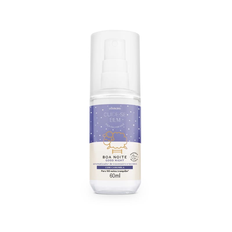 Aromatizador de Travesseiros e Tecidos Cuide-se Bem Boa Noite 60ml<br /> Todo produto que ajuda a melhorar sua noite de sono, merece um lugar especial no seu coração! O Aromatizador de Travesseiros e Tecidos Cuide-se Bem Boa Noite é perfeito para completar o seu ritual de cuidados antes de dormir.<br /> <br /> <br /> <br /> Sua fórmula com Camomila deixa travesseiros e tecidos com um cheirinho delicioso e confortável. O aromatizador de tecidos promove sensação de relaxamento durante o sono e pode proporcionar até 100 noites tranquilas, considerando 4 borrifadas diárias. Além de poder ser aplicado nos travesseiros e lençóis, pode ser usado para passar roupas, perfumando-as. E não se preocupe, ele não mancha.<br /> <br /> <br /> <br /> O Aromatizador de Travesseiro e Tecidos Cuide-se Bem Boa Noite tem a fragrância relaxante de Floral Musk da linha. Prepare-se para uma noite de sono tranquila com uma rotina de cuidados que prepara para dormir!<br /> <br /> <br /> <br /> Segredinho do bem: Cuide-se Bem Boa Noite é uma linha do Boticário com produtos 100% veganos e embalagens feitas com plástico reciclável.<br /> <br /> <br /> <br /> <br /> <br /> Nenhum produto do Boticário é testado em animais.<br /> <br /> <br /> <br /> <br /> <br /> *Ingredientes atualizados na data desta publicação. Mas é importante lembrar de sempre verificar a embalagem, a informação mais atual é a do rótulo do produto.