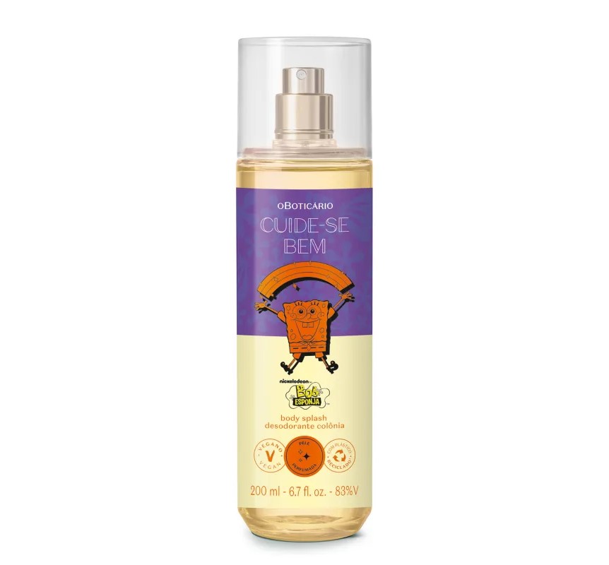 Body Splash Desodorante Colônia Cuide-se Bem Bob Esponja 200ml<br /> Vocês estão prontos, botilovers? <br /> <br /> <br /> Estamos, capitão!<br /> <br /> <br /> Já diria Bob Esponja: “estou pronto”!<br /> <br /> <br /> Cuide-se Bem e Bob Esponja criaram a fórmula secreta ideal para o seu momento de cuidado! Em edição limitada, o Body Splash Desodorante Colônia Cuide-se Bem Bob Esponja entrega cheirinho de banho tomado com fragrância inspirada no abacaxi¹! <br /> <br /> <br /> É ano de festa na fenda do biquini! Celebramos os 25 anos do Bob Esponja, comemorado na Década do Oceano. Esse body splash vegano possui 94% Ingredientes Naturais² e embalagem feita com plástico reciclado.<br /> <br /> <br /> Faça parte da tripulação ajudando a proteger o oceano! Quando seu produto acabar, descarte a embalagem em nossas lojas, e cuidaremos da reciclagem, combinado?<br /> <br /> <br /> Família Olfativa: Frutal Gourmand.<br /> <br /> <br /> SOBRE A LINHA<br /> <br /> <br /> Cuide-se Bem Bob Esponja descobriu a fórmula secreta combinando texturas deliciosas com cheirinho inspirado em abacaxi¹ e os personagens tão amados do fundo do mar. Já diria Bob Esponja: “estou pronto”!<br /> <br /> <br /> Nenhum produto do Boticário é testado em animais, ou seja, este item possui selo Cruelty Free. Produto vegano.<br /> <br /> <br /> ¹ Não contém abacaxi.