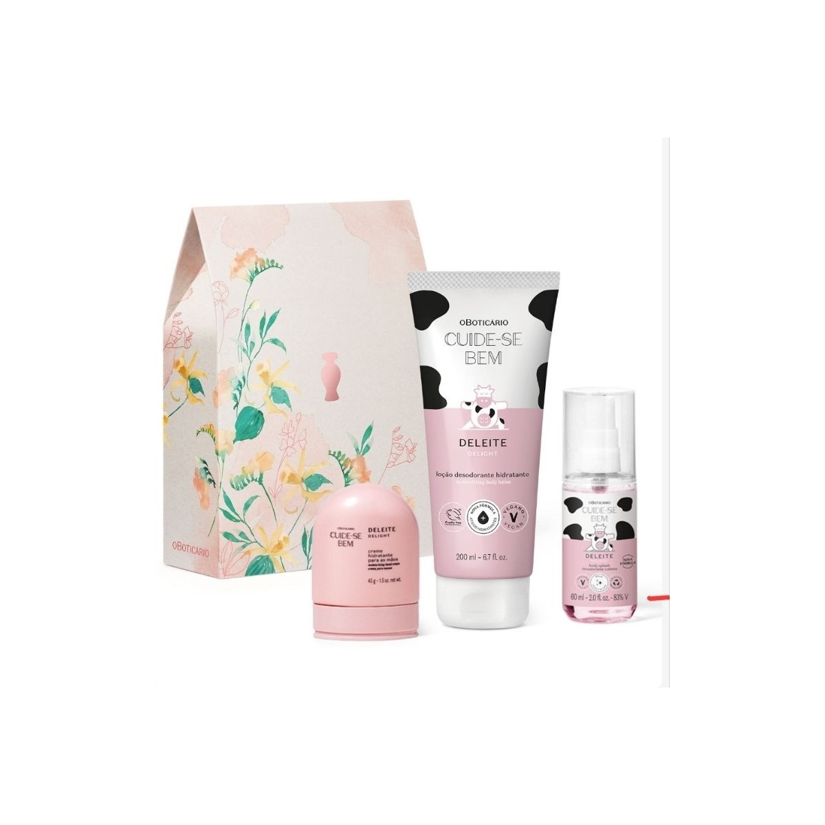 O Kit Presente Cuide-se Bem Deleite Mães 2024, traz uma fragrância doce e inesquecível, ideal para a rotina de cuidados.<br /> <br /> Para deixar tudo mais especial, o kit vem pronto para presentear em uma caixa para presente que transmite cuidado em cada detalhe, para uma lembrança especial:<br /> <br /> BODY SPLASH:<br /> O Body Splash Cuide-Se Bem Deleite prolonga a sensação de frescor pós-banho com sua fragrância leve e suave.<br /> <br /> A fragrância gourmand traz na saída anis fresco estrelado, aliado ao coração com frésia, flor de caramelo, orquídea mashmallow de ouro, chantilly e vanilla.<br /> <br /> Por fim, a base é composta por benjoim, sândalo, ambrette, creme de baunilha cedro cremoso e fluffy musk.<br /> <br /> <br /> LOÇÃO CORPORAL:<br /> <br /> A Loção Desodorante Hidratante Corporal Cuide-se Bem Deleite confere até 48 horas de hidratação e perfumação do jeito que a gente gosta.<br /> <br /> Sua textura é absorvida rapidamente pela pele e também desodoriza o corpo.<br /> <br /> <br /> CREME PARA MÃOS: Com a mesma perfumação da linha, o Creme para Mãos Hidratante Desodorante<br /> Cuide-se Bem Deleite hidrata intensamente mãos e cotovelos por até 30 horas.<br /> <br /> O kit contém:<br /> <br /> 1 - Loção Corporal Deleite 200 mL;<br /> <br /> 1 - Body Splash Colônia Deleite 60 mL;<br /> <br /> 1 - Hidratante Mãos Deleite 45g.<br /> <br /> Presenteie sua Mãe com o Boticário.