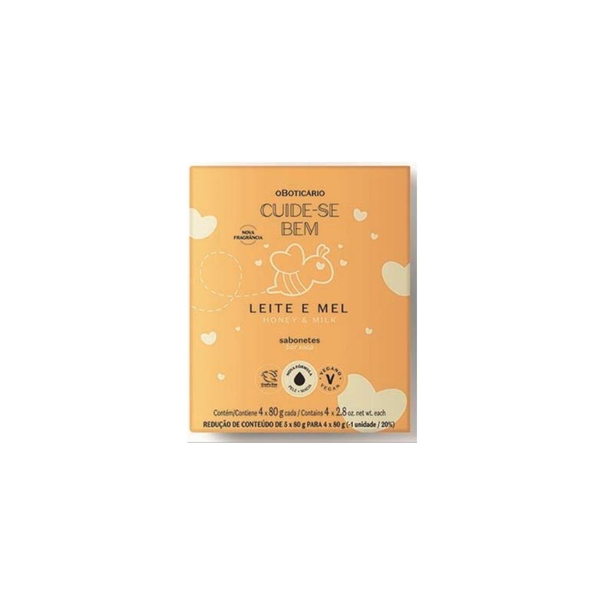 Lançamento O Boticário!<br />  <br /> Novo formato de Sabonetes Em Barra Cuide-se Bem Leite&Mel.<br />  <br /> Caixa contém 4 unidades de 80g cada.<br />  <br /> Nova Fragrância Leite&Mel.<br />  <br /> Nova fórmula.<br />  <br /> Pele mais macia.<br />  <br /> Produto vegano.<br />