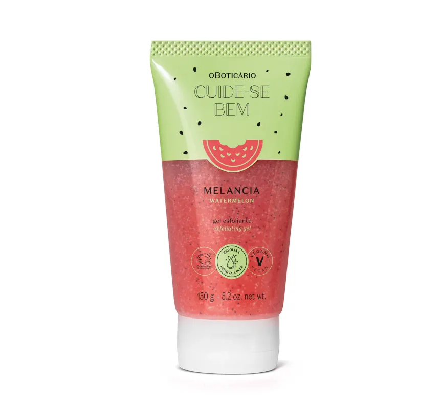 Gel Esfoliante Corporal Cuide-se Bem Melancia 150g<br /> Foi aqui que pediram produtos de melancia? <br /> <br /> <br /> Seu pedido é uma ordem! <br /> <br /> <br /> A linha Melancia cresceu! E agora Cuide-se Bem trouxe um dos cheirinhos mais pedidos: o Gel Esfoliante Corporal Cuide-se Bem Melancia vai deixar sua pele lisinha e com uma fragrância energizante de melancia, mesmo após o banho!<br /> <br /> <br /> Dá só uma olhada nos benefícios:<br /> <br /> <br /> Fragrância frutal inspirado na melancia;<br /> Textura esfoliante;<br /> Remove as impurezas e células mortas; <br /> Pele perfumada;<br /> Sensação de pele hidratada.<br /> <br /> Livre de sulfatos, parabenos e petrolatos, contém 94% dos ingredientes naturais, fórmula vegana e embalagem feita com plástico vegetal. Um esfoliante corporal de melancia que oferece autocuidado em uma opção prática e sustentável.<br /> <br /> <br /> O resultado? pele macia e com cheiro de melancia!