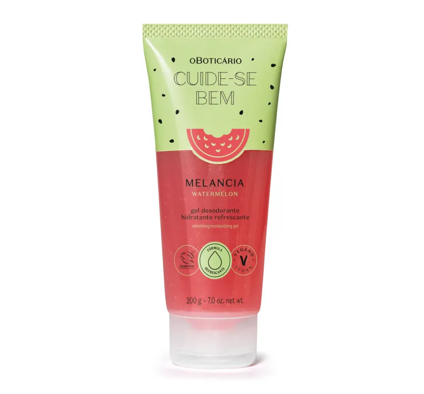 Gel Desodorante Hidratante Refrescante Cuide-se Bem Melancia 200g<br /> Foi aqui que pediram produtos de melancia? <br /> <br /> <br /> Seu pedido é uma ordem.<br /> <br /> <br /> A linha Melancia cresceu, e agora Cuide-se Bem trouxe um dos cheirinhos mais pedidos: O Gel Desodorante Hidratante Refrescante Cuide-se Bem Melancia possui textura levinha e refrescante, extrato da fruta e ativos hidratantes, além da fragrância energizante da melancia, para você aproveitar os seus dias com toda a doçura e refrescância da fruta. <br /> <br /> <br /> Dá só uma olhada nos benefícios:<br /> <br /> <br /> Fragrância frutal inspirado na melancia;<br /> Textura levinha e não pegajosa;<br /> Refrescância imediata;<br /> 24 horas de hidratação;<br /> Ultra-reparação.<br /> Fórmula levinha e refrescante.<br /> <br /> Livre de parabenos e silicones, contém 95% de ingredientes naturais, fórmula vegana e embalagem feita com plástico vegetal.<br /> <br /> <br /> O resultado? pele fresquinha, hidratada e com cheiro de melancia.<br />