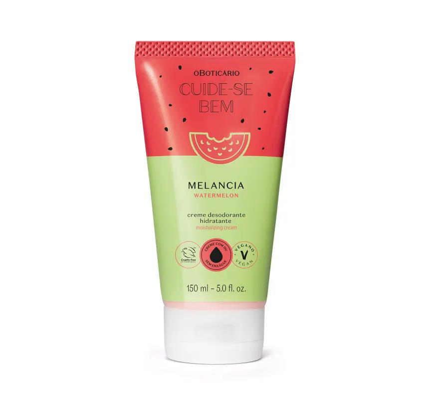 Creme Desodorante Hidratante Corporal Cuide-se Bem Melancia 150ml<br /> <br /> <br /> A linha Melancia cresceu! Agora com novas texturas e muita hidratação. Cuide-se Bem atendeu ao seu pedido e trouxe uma linha em edição limitada com toda a doçura e refrescância da fruta , para deixar sua pele cheirosa e hidratadíssima!!<br /> <br /> <br /> Nenhum produto O Boticário é testado em animais, ou seja, este item possui selo Cruelty Free. Produto vegano.