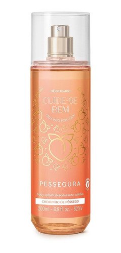 Body Splash Desodorante Corporal Cuide-se Bem Pessegura 200ml Já que é pra encarar a vida, que seja com cheirinho de pêssego. Pensando nisso, o Boticário apresenta o Body Splash Desodorante Colônia Cuide-se Bem Pessegura que é a escolha perfeita para perfumar a sua pele após o banho. O Body Splash faz parte da família olfativa Floral Frutal e sua fragrância traz o protagonismo das flores e das frutas com o conforto do Musk.