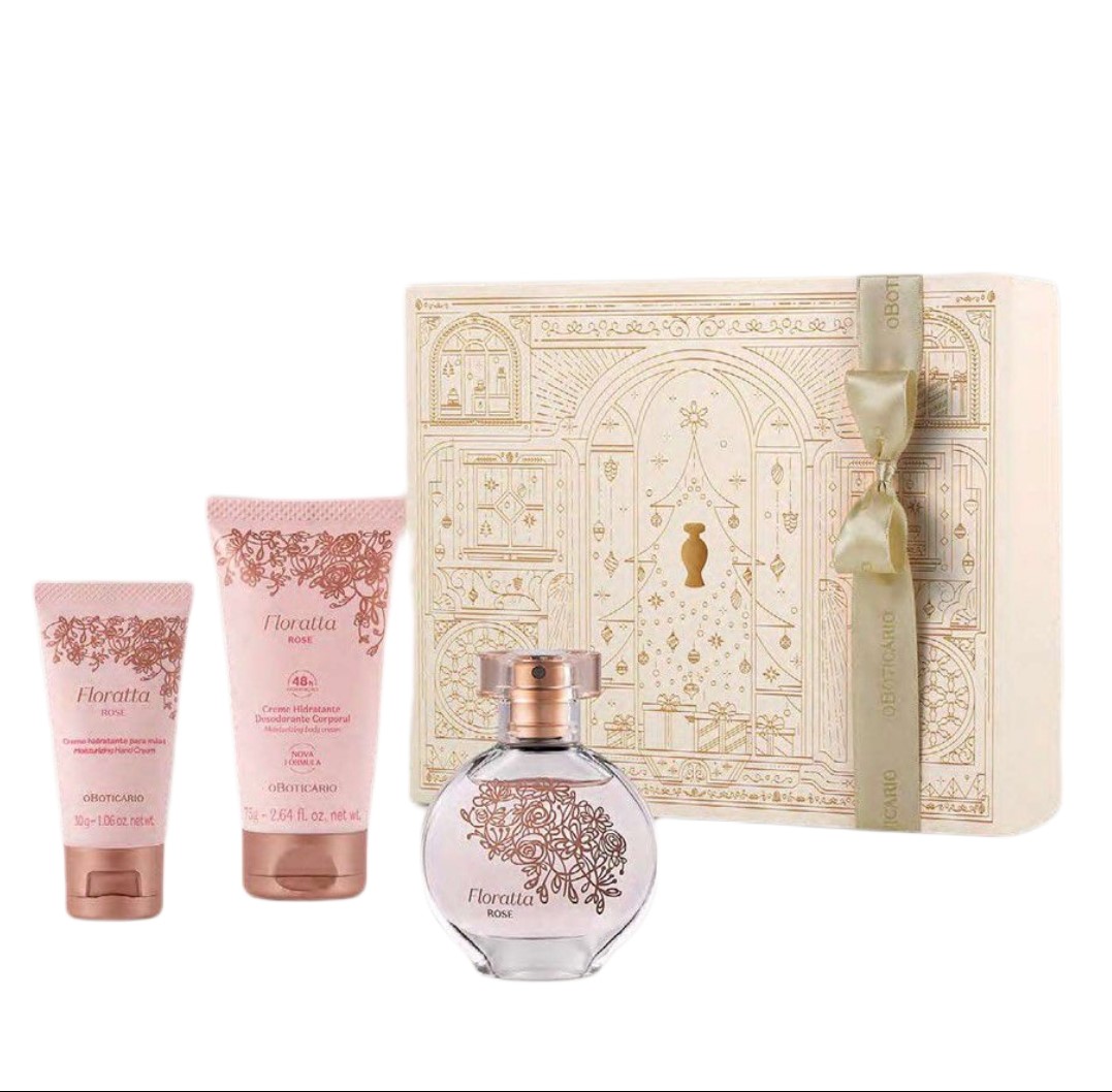 O Boticário Kit Presente Natal: Floratta Rose<br /> <br /> Contém:<br /> <br /> 01 Floratta Rose Deo Colônia 30ml.<br /> <br /> 01 Creme Para Mãos Floratta Rose 30g.<br /> <br /> 01 Floratta Rose Hidratante Corporal 75g.