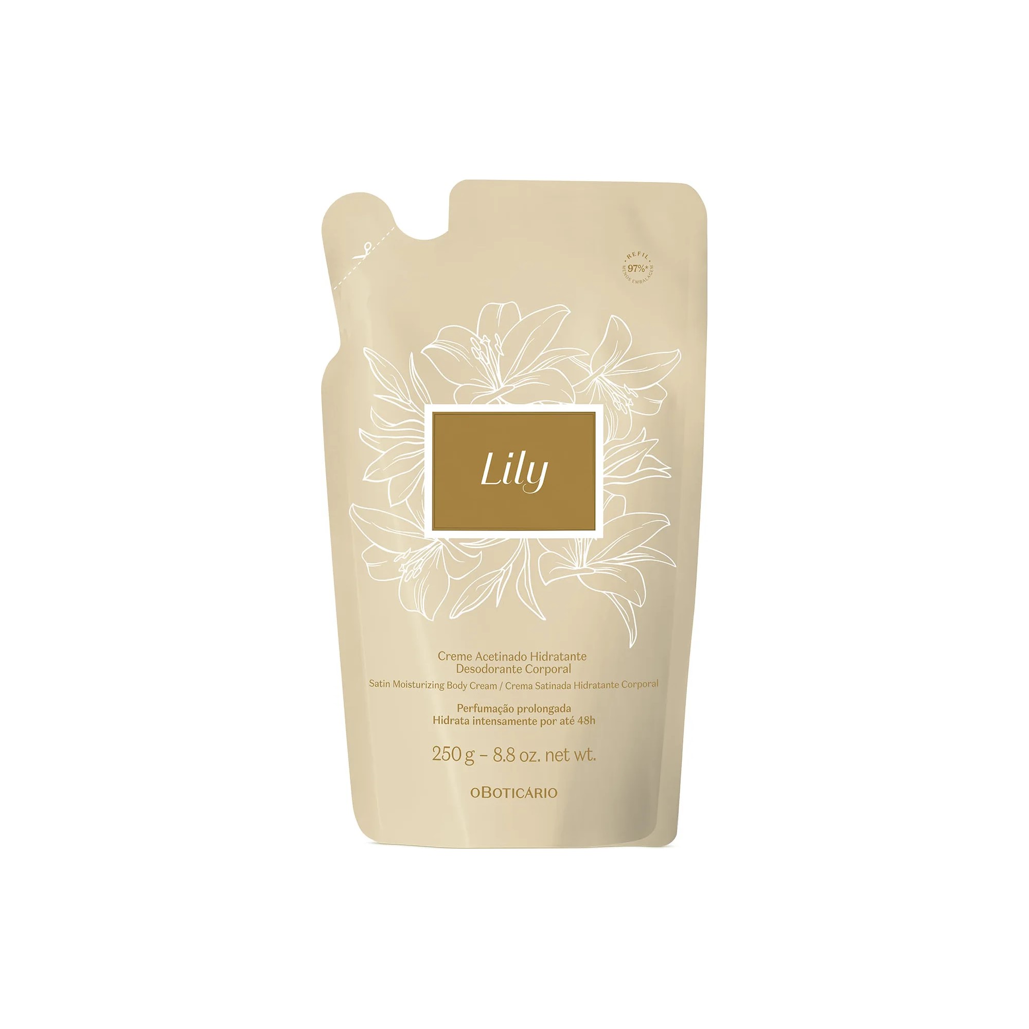 Refil Creme Acetinado Hidratante Desodorante Corporal Lily 250g<br /> O Refil Creme Acetinado Hidratante Desodorante Corporal Lily entrega perfumação prolongada e fragrância intensa para sua pele na medida certa.<br /> <br /> <br /> Sua fórmula possui Manteiga de Karité que cria uma película protetora, e Vitamina E que deixa sua pele protegida o dia todo, além de entregar hidratação por até 48 horas, rápida absorção e sensação de pele sequinha e macia. Garantindo: <br /> <br /> <br /> -Perfumação intensa e prolongada;<br /> <br /> <br /> -Hidratação por até 48h;<br /> <br /> <br /> -Textura macia e aveludada;<br /> <br /> <br /> -Deslizar suave pela sua pele.<br /> <br /> <br /> Sua embalagem em Refil é a melhor opção para repor o seu produto favorito. Além de trazer mais economia, garante mais responsabilidade com o meio ambiente através do aproveitamento da embalagem original. Tudo para envolver sua pele com proteção e perfumação, em qualquer rotina.<br />