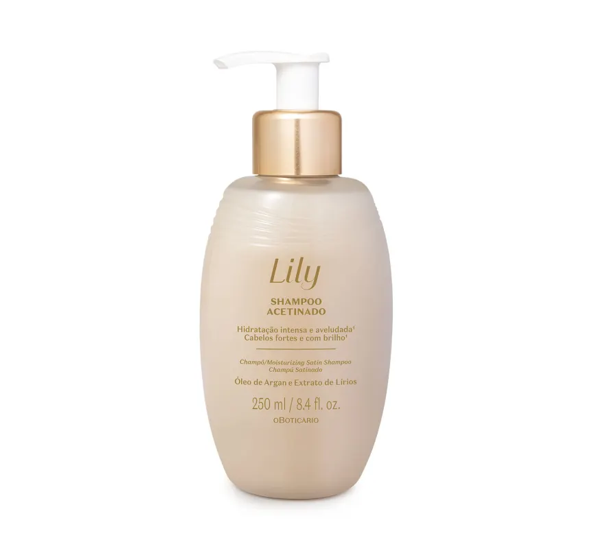Shampoo Acetinado Lily 250ml<br /> O Shampoo Acetinado Lily traz a fragrância tão amada, agora com o poder do toque aveludado nos seus fios, fazendo parte da sua rotina de cuidados capilares.<br /> <br /> Para todos os tipos de cabelo, proporciona hidratação intensa e aveludada, promovendo cabelos fortes e com brilho. Junto ao uso da linha completa, promove um ritual de revitalização aos fios, enquanto realiza uma limpeza eficaz.<br /> <br /> <br /> <br /> Com Óleo de Argan e Extrato de Lírios, o shampoo lily possui uma textura diferenciada e toque acetinado para realçar a beleza dos seus cabelos. Além disso, entrega a fragrância intensa de Lily Tradicional e uma embalagem sofisticada, tornando-se também o melhor dos presentes.<br /> <br /> <br /> <br /> Nenhum produto do Boticário é testado em animais, ou seja, este item possui selo Cruelty Free.