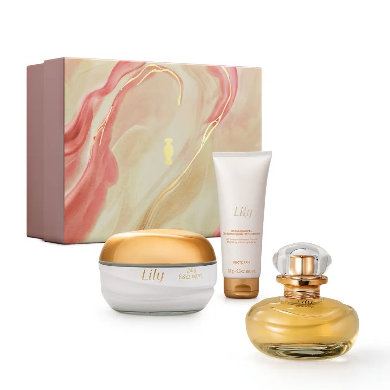 Kit Presente Lily (3 itens)<br /> O Kit Presente Dia dos Namorados Lily vem com fragrância em miniatura que traz a mais pura perfumação dos lírios para o dia a dia de mulheres românticas. Além disso, vem com hidratação com toque acetinado e geleia iluminadora em edição especial. Os três itens vêm guardados em uma caixa de presente especial. Um kit presente feminino para encantar no dia do amor:<br /> <br /> <br /> EAU DE PARFUM<br /> <br /> <br /> Os acordes marcantes de Lily Eau de Parfum em miniatura revivem a exclusividade do fazer artesanal e traduzem o luxo de satisfazer intensamente as emoções. Sua fragrância abre com notas de Mandarina, Pera, Pêssego, Damasco e Pimenta Rosa, que evoluem para um coração com Osmanthus, Gardênia, Jasmim, Rosa, Violeta, Lírio, Íris e Narciso, e finalizam com notas de fundo de Sândalo, Musgo, Musk, baunilha, patchouli, vetiver e âmbar. <br /> <br /> <br /> Família Olfativa: Floral Bouquet<br /> <br /> <br /> CREME ACETINADO CORPORAL<br /> <br /> <br /> Para o momento de autocuidado, o Creme Acetinado Hidratante Desodorante Corporal Lily possui uma textura acetinada que protege a sua pele com uma película protetora. Além de promover uma hidratação intensa, também ajuda a evitar o ressecamento da pele causado pelo sol e pelo clima frio e seco. <br /> <br /> <br /> GELÉIA ILUMINADORA<br /> <br /> <br /> Em uma versão prática e compacta para levar para todos os lugares, a Geleia Iluminadora Desodorante Hidratante Corporal Lily entrega uma pele com efeito glow, embelezando-a com hidratação intensa, mesmo toque acetinadoe a mesma fragrância inesquecível do creme acetinado Lily. <br /> <br /> <br /> CAIXA PARA PRESENTE<br /> <br /> <br /> Amor bom é amor que flui. Trazemos essa fluidez também para nossas embalagens. Para isso, buscamos elevar a aquarela a sua máxima sofisticação. O resultado desta caixa de presente é arte com pinceladas e colorações minimalistas em tons rosados e românticos. <br /> <br /> <br /> Dimensões: 28 x 10 X 21 cm<br /> <br /> <br /> MAIS PRESENTE<br /> <br /> <br /> Você escolhe um presente, seu amor ganha dois! Como funciona? Escolha este kit especial para presentear. Dentro do kit, está um voucher que dá acesso ao site exclusivo da ação. Nesse site, a pessoa presenteada escolhe um presente extra. Prontinho!<br /> <br /> <br /> Presenteie a sua pessoa especial no Dia dos Namorados O Boticário 2024.<br /> <br /> <br /> Nenhum produto do Boticário é testado em animais, ou seja, este item possui selo Cruelty Free. <br /> <br /> <br /> O Boticário. Eleita a melhor marca para presentear quem se ama*.<br /> <br /> <br /> *Declaração comparativa entre as 14 principais marcas de fragrâncias, beleza e cosméticos para presentear.<br /> <br /> <br /> Fonte: Kantar Insights| 400 entrevistas Fev’2024| TTBR<br /> <br /> <br /> Este kit contém:<br /> <br /> <br /> 01 Lily Eau De Parfum 30ml<br /> <br /> <br /> 01 Creme Acetinado Hidratante Desodorante Corporal Lily 250g<br /> <br /> <br /> 01 Geleia Iluminadora Desodorante Hidratante Corporal Lily 75g