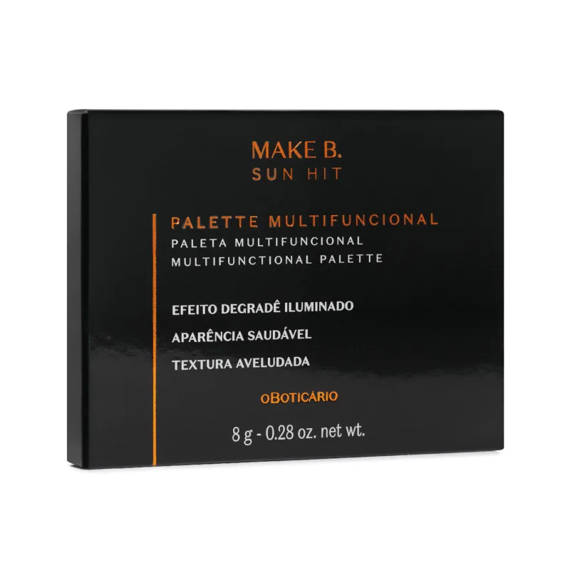 Paleta de Maquiagem Multifuncional Make B. Sun Hit 8g<br /> AMAMOS o verão: a cor e o iluminado natural que ele proporciona embeleza. Queremos esse efeito na pele o ano inteiro!<br /> <br /> <br /> A Paleta de Maquiagem Multifuncional Make B. Sun Hit entrega 6 cores ideais para looks iluminados como os dias de verão! Com exclusivo efeito degradê, garante diferentes combinações de cores e efeitos.<br /> <br /> <br /> Sua fórmula leve e aveludada, é de fácil aplicação. E seu efeito degradê possibilita que as cores, de blush e iluminador, possam ser aplicadas juntas ou separadas, proporcionando efeitos únicos para uma pele com aparência saudável e radiante. <br /> <br /> <br /> -Paleta multifuncional: iluminador e blush;<br /> <br /> <br /> -Efeito degradê: blend de 6 cores para usar juntas ou separadas;<br /> <br /> <br /> -Combina com diversos tons de pele;<br /> <br /> <br /> -Textura leve e aveludada;<br /> <br /> <br /> -Acabamento natural e iluminado.<br /> <br /> <br /> Make B. Sun hit se inspirou no clima tropical brasileiro para capturar os efeitos dos reflexos do sol e colorir e iluminar a pele com um brilho instantâneo, natural e saudável na maquiagem para o rosto.