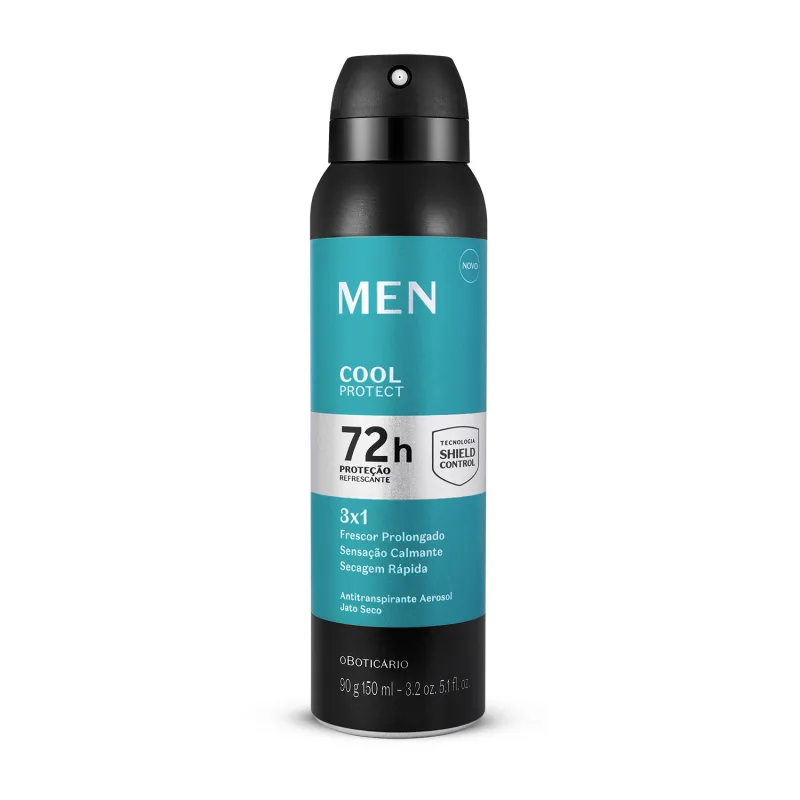 Desodorante Antitranspirante Aerosol Men Cool Protect 90g/150ml<br /> Men une tecnologia a fórmulas potentes para desenvolver o seu melhor aliado contra a transpiração.<br /> <br /> <br /> <br /> O Desodorante Antitranspirante Aerosol Men Cool Protect entrega proteção prolongada contra a transpiração e cuidados intensos para sua pele.<br /> <br /> <br /> <br /> Ideal para a rotina agitada, este desodorante aerosol promove 72 horas de proteção antibacteriana, deixando sua pele livre de maus odores. Com toque seco, seca rapidamente e não mancha suas roupas, além de garantir sensação calmante para suas axilas.<br /> <br /> <br /> <br /> Com a exclusiva Tecnologia Shield Control desenvolvida por experts em ciência da pele. Conta com uma potente fórmula antitranspirante, combinada a um blend de Alantoína, Bisabolol e Vitamina E, reconhecidos por proteger, acalmar e cuidar da pele. <br /> <br /> <br /> <br /> Confira alguns de seus benefícios:<br /> <br /> <br /> <br /> 72h de proteção contra o mau odor e transpiração;Sensação de frescor prolongado;Sensação calmante;Toque seco;0% álcool etílico e corantes;Clinicamente e dermatologicamente testado.<br /> <br /> <br /> <br /> O Desodorante Aerosol Men Cool Protect entrega frescor prolongado, sensação calmante e secagem rápida, em um único produto.<br /> <br /> <br /> <br /> Nenhum produto O Boticário é testado em animais, ou seja, este item possui selo Cruelty Free.
