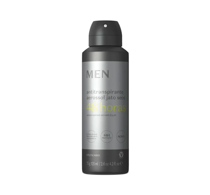Desodorante Antitranspirante Aerossol MEN 75g/125ml<br /> O Desodorante Antitranspirante Aerossol MEN é um item que complementa a rotina de cuidados do homem moderno que vive na correria. Proporcionando benefícios incríveis, o desodorante masculino é a solução prática para os seus problemas!<br /> <br /> Oferecendo 48 horas de proteção contra as bactérias do mau odor e da transpiração, o antitranspirante aerossol não pode faltar no nécessaire masculino. Seu jato seco minimiza a formação de manchas na roupa, facilitando assim o seu dia a dia.<br /> <br /> <br /> <br /> <br /> <br /> Sua fórmula seca rápido, proporciona sensação de frescor, mantém a hidratação da pele e possui a fragrância fresca e moderna de MEN. Suas notas cítricas e aromáticas potencializam a perfumação de MEN Desodorante Colônia.<br /> <br /> <br /> <br /> <br /> <br /> Sua fórmula vegana traz a preocupação em proteger nossa fauna, ou seja, ela não possui componentes de origem animal. Ficou ainda mais fácil cuidar de si mesmo e do planeta. Vai de MEN, man!<br /> <br /> <br /> <br /> <br /> <br /> Nenhum produto do Boticário é testado em animais. Produto vegano.
