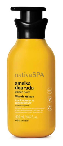 Nativa SPA Ameixa Dourada o Boticário Loção desodorante corporal. Nativa SPA Ameixa Dourada o Boticário conta com fragrância energizante e nutrição, para um aspecto saudável com brilho radiante. A Loção Radiante Desodorante Corporal Nativa SPA Ameixa Dourada o Boticário traz 96% de ingredientes naturais e proporciona uma pele hidratada, nutrida e radiante. A textura cremosa aliada a uma fragrância brilhante e energizante, marcada pela suculência da Ameixa Dourada e notas cremosas e confortáveis que destacam sensualidade e radiância. A fórmula promove hidratação imediata, intensa e prolongada; protege a pele do ressecamento; melhora a barreira cutânea; tem toque seco e rápida absorção sem a sensação de pele pegajosa. Nativa SPA apresenta uma nova faceta da ameixa em sua versão mais sofisticada e dourada como o sol: a Ameixa Dourada. Com a energia do amarelo em uma embalagem vibrante com plástico 100% vegetal e uma fragrância energizante e sensual, essa linha é ideal para a mulher que quer se sentir dourada por dentro: com um brilho que irradia e se destaca na multidão, além de poderosa, livre e radiante, para viver a vida com intensidade! Nenhum produto do Boticário é testado em animais, ou seja, este item possui selo Cruelty Free. Produto vegano.