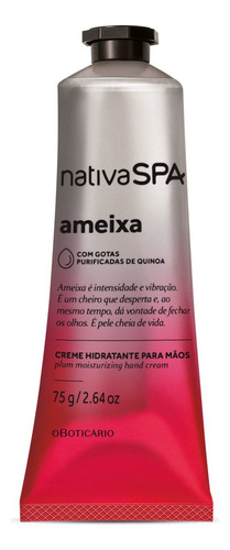 O Nativa SPA Ameixa Creme Hidratante para Mãos Desodorante cuida da pele das mãos para deixá-las macias, hidratadas e perfumadas todos os dias. Com textura incrivelmente leve, apresenta nova fórmula com gotas purificadas de quinoa, um óleo 100% puro que oferece grande poder de hidratação, ajudando também a rejuvenescer a pele e deixá-la macia. Além disso, ainda traz a fragrância de Ameixa, que transmite intensidade e vibração, para deixar as mãos perfumadas. A nova embalagem é ainda mais charmosa, trazendo um tom metálico degradê. É versátil e pode ser carregada na bolsa com facilidade. Contém: 75g