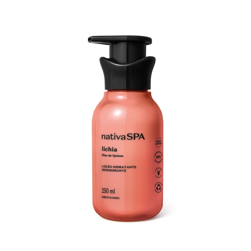 Loção Hidratante Desodorante Corporal Nativa SPA Lichia 250ml<br /> A Loção Hidratante Desodorante Corporal Nativa SPA Lichia entrega hidratação intensa e um cheiro irresistível para a pele. <br /> <br /> <br /> <br /> Formulado com Óleo de Quinoa, auxilia na produção do colágeno da pele, além de contar com a fragrância incrível de Lichia.<br /> <br /> <br /> <br /> A fragrância da loção corporal desodoriza a pele, enquanto entrega a combinação ideal de Lichia, Frutas Vermelhas e Lírio. Essa mistura traz para sua rotina de autocuidado um Frutal Floral irresistível.<br /> <br /> <br /> <br /> A loção corporal de 250ml é feita com plástico reciclado, e além de ter o tamanho ideal para durar bastante, traz inúmeros benefícios para a sua pele. Confira só: <br /> <br /> <br /> <br /> -Hidratação profunda;<br /> <br /> -96% de ingredientes naturais;<br /> <br /> -Pele macia e com aspecto saudável;<br /> <br /> -Previne a perda de elasticidade da pele;<br /> <br /> -Estimula em até 77% a produção de colágeno natural da pele*<br /> <br /> <br /> <br /> Em uma edição exclusiva e limitada para as Nativa Lovers, a Loção Corporal Nativa SPA Lichia é ideal para sua rotina de autocuidado. <br /> <br /> <br /> <br /> SOBRE A LINHA<br /> <br /> Você pediu. Elas voltaram! Nativa SPA Lichia celebra suas linhas mais icônicas e amadas em um novo formato, mas com a mesma fragrância pela qual as consumidoras se apaixonaram!<br /> <br /> <br /> <br /> *Estudo in vitro em pele 3D do ingrediente bioéster de quinoa.<br /> <br /> <br /> <br /> Nenhum produto O Boticário é testado em animais, ou seja, este item possui selo Cruelty Free.