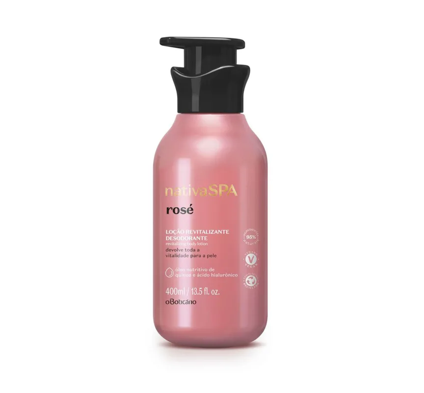 Loção Revitalizante Desodorante Corporal Nativa Spa Rosé, 400 ml<br /> A Loção Revitalizante Desodorante Corporal Nativa Spa Rosé é uma linha de cuidados para o corpo e cabelos criada a partir da combinação de extratos das rosas Damascena, Bourbaniana, Mosqueta e Branca. Uma alquimia perfeita com uma fragrância que traz a faceta mais moderna das flores.<br /> <br /> A Loção revitalizante Rosé possui uma exclusiva combinação de rosas, óleo nutritivo de quinoa e ácido hialurônico, que recupera a pele sem vida na 1º aplicação.<br /> <br /> O produto proporciona uma hidratação profunda na pele, desodoriza e nutre, deixando-a macia e iluminada.<br /> <br /> Como segredinho de sustentabilidade, sua fórmula é vegana e conta com 95% de ingredientes naturais.<br /> <br /> Família olfativa: Chypre Floral