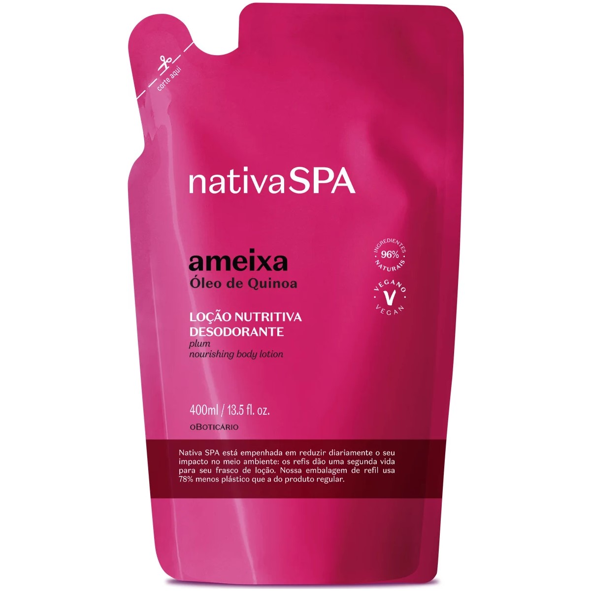 Refil Loção Desodorante Hidratante Corporal Nativa SPA Ameixa 400ml<br /> O Refil Loção Desodorante Hidratante Corporal Nativa SPA Ameixa entrega a reposição de sua fragrância favorita com praticidade e economia.<br /> <br /> <br /> <br /> A fórmula de Nativa SPA Ameixa é enriquecida com gotas purificadas de quinoa, considerada a semente da beleza, a quinoa oferece inúmeros benefícios, como hidratação profunda, aumento da produção de colágeno e prevenção da perda de elasticidade da pele. <br /> <br /> Além de hidratar por horas, o Refil da Loção Corporal traz a fragrância marcante e intensa da Ameixa em microcápsulas. Essa tecnologia entrega maior perfumação para sua pele, pois ao longo do dia essas esferas se rompem e entregam um momento de fragrância intenso para seu dia.<br /> <br /> Garantindo benefícios como:<br /> <br /> Praticidade;Desodorização para a pele;Economia;Hidratação o dia todo;Perfumação na medida certa.<br /> <br />