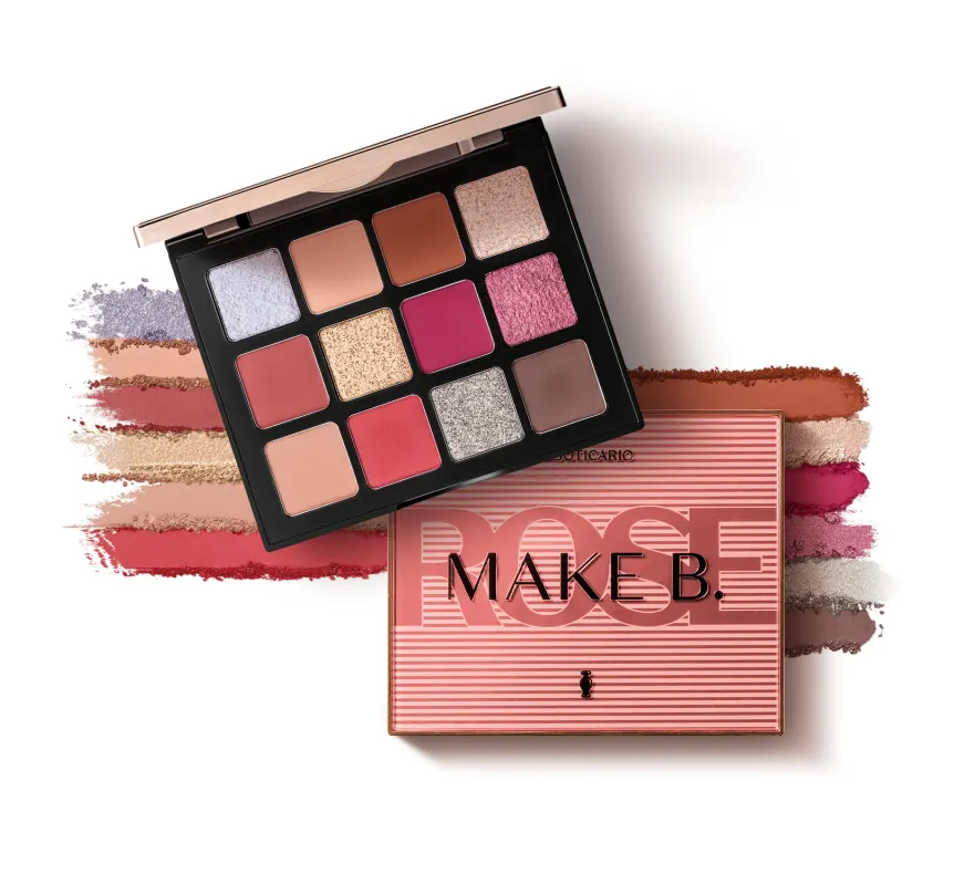 Palette De Sombras Make B. Rose 14,4g<br /> A Palette De Sombras Make B. Rose, de cara nova e com novas cores! Com 12 cores, é aquele item de maquiagem para o rosto que não pode faltar no seu nécessaire, pois te permite se reinventar e criar sua make com possibilidades ilimitadas. <br /> <br /> <br /> <br /> Com tons rosados e impactantes, as novas cores e texturas te dão a possibilidade de infinitos looks, além de:<br /> <br /> <br /> <br /> Super pigmentação na primeira passada;<br /> <br /> Longa Duração;<br /> <br /> Acabamentos matte aveludado, super brilho e cintilante.<br /> <br /> <br /> <br /> Com embalagem moderna, prática e compacta, você leva sua paleta de maquiagem para onde quiser, seja para os compromissos do dia a dia, para destacar a sua beleza natural, ou para aquela ocasião especial, onde você pode combinar as cores para uma make com olhar marcante.<br /> <br /> <br /> <br /> Se a Palette Multifuncional #2 Bronze Intense não saia do seu nécessaire, então você vai se encantar pelas cores, texturas e efeitos que essa paleta de sombras Make B. oferece para o seu visual. <br /> <br /> <br /> <br /> Nenhum produto do Boticário é testado em animais, ou seja, este item possui selo Cruelty Free.
