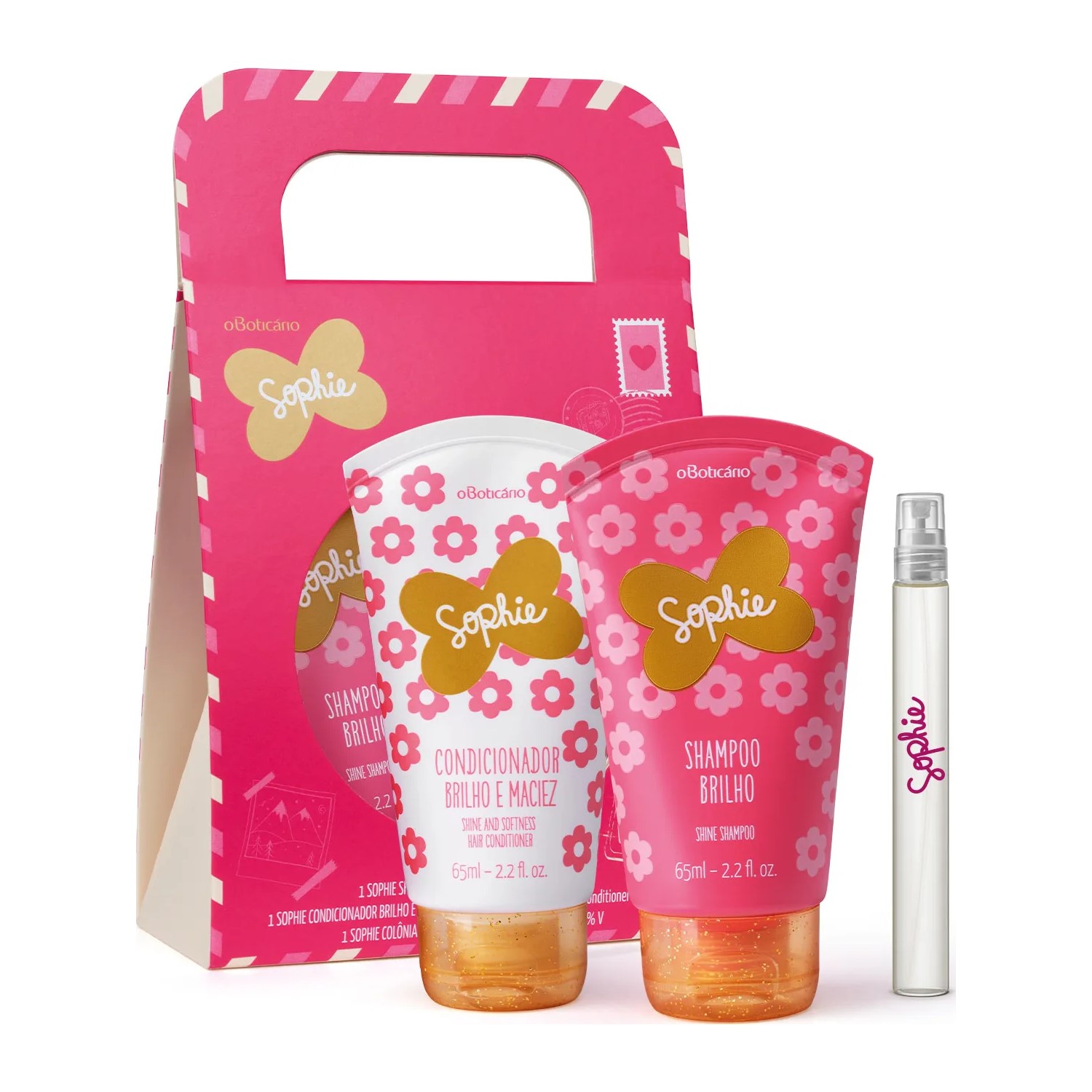 Conjunto Sophie #AMOVIAJAR o Boticário Infantil (3 Produtos).<br /> <br /> <br /> Conjunto infantil com colônia Sophie Hello, shampoo e condicionador o Boticário. Traz miniaturas para acompanhar as viagens mais incríveis.<br /> <br /> O Conjunto Sophie #AMOVIAJAR o Boticário Infantil é ideal para meninas de 7 a 12 anos que amam se cuidar. Com a fragrância Floral Fresca, esses produtos têm um cheiro levinho, ótimo para divertir e perfumar durante toda a viagem. <br /> <br /> <br /> <br /> <br /> Contém:<br /> <br /> Sophie Hello o Boticário - Colônia Infantil 10ml;<br /> <br /> Foi desenvolvida para a pele de crianças, ou seja, não causa irritações ou reações alérgicas. Ela possui fragrância Floral Fresca, suave e promove 8h de perfumação delicada. <br /> <br /> <br /> Sophie o Boticário - Shampoo 65ml;<br /> <br /> Possui Óleo de Argan, Pantenol e Vitamina B5 em sua fórmula. Além de um cheirinho delicioso, esses ingredientes deixam o cabelo cheio de brilho e maciez para curtir a viagem com muito mais frescor. Ah, vale lembrar que esse produto pode ser usado em todos os tipos de cabelo, dos cachinhos aos lisos e ondulados. <br /> <br /> <br /> Sophie o Boticário - Condicionador 65ml;<br /> <br /> É o complemento que traz ainda mais tratamento e maciez aos fios. Com o mesmo cheirinho e ingredientes do shampoo, esse produto não irrita os olhos e deixa os fios muito mais nutridos e leves. <br />