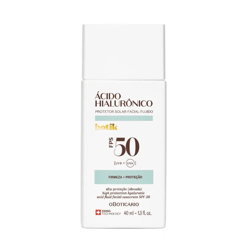 Protetor Solar Facial Fluido FPS 50 Botik Ácido Hialurônico 40ml<br /> O Protetor Solar Facial Fluido FPS 50 Botik Ácido Hialurônico é o último passo da sua rotina de skincare diurna, oferecendo proteção solar e tratamento para a pele. Sua fórmula com Ácido Hialurônico foi especialmente desenvolvida para proteger, hidratar, prevenir o envelhecimento precoce e a perda de firmeza da pele.<br /> <br /> <br /> Sua textura fluida com acabamento invisível possui rápida absorção e efeito mate, que controla o brilho e reduz a oleosidade excessiva. Além disso, auxilia na prevenção dos sinais do envelhecimento precoce, evitando a perda de firmeza e protegendo a pele contra danos nocivos causados pelo sol e pela luz azul.<br /> <br /> <br /> Conheça mais benefícios deste protetor solar para o rosto:<br /> <br /> <br /> -Para todos os tipos de pele;<br /> <br /> <br /> -Preenche e reduz rugas e linhas de expressão;<br /> <br /> <br /> -Melhora a firmeza da pele;<br /> <br /> <br /> -Controla o brilho causado pela oleosidade por até 8 horas;<br /> <br /> <br /> -Pele mais iluminada;<br /> <br /> <br /> -Suaviza a aparência de poros visíveis;<br /> <br /> <br /> -Acabamento invisível;<br /> <br /> <br /> -Toque seco ;<br /> <br /> <br /> -Não esfarela e não escorre ao longo do dia.<br /> <br /> <br /> -Dermatologicamente testado; Oftalmologicamente testado; Não comedogênico.<br /> <br /> <br /> Botik tem a missão de trazer os melhores ativos para a sua pele, atrelados à avançada tecnologia suíça, para uma rotina de autocuidado eficaz.<br />