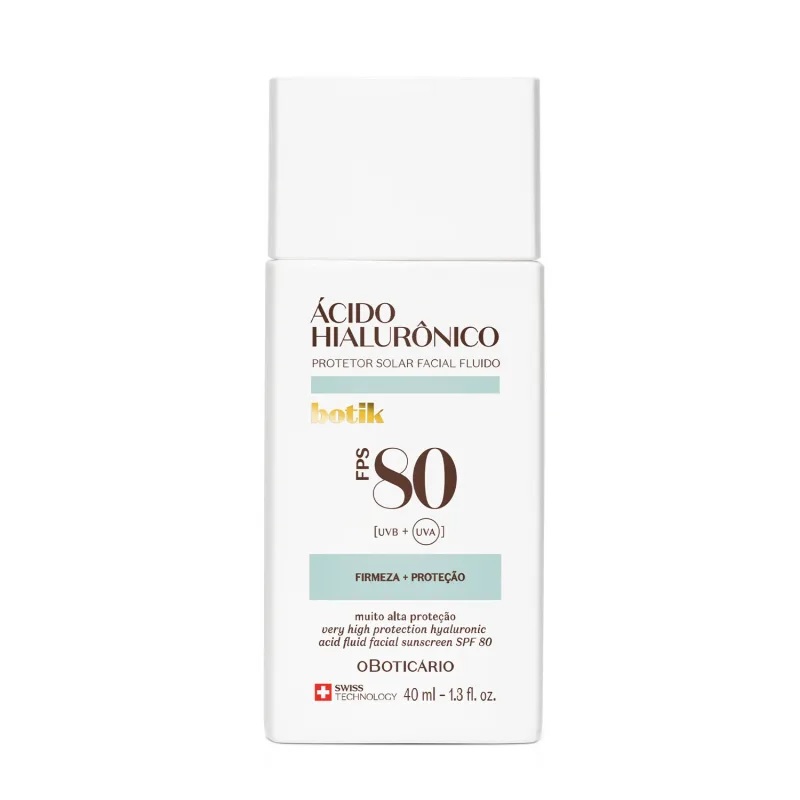 Protetor Solar Facial Fluido FPS 80 Botik Ácido Hialurônico 40ml<br /> O Protetor Solar Facial Fluido FPS 80 Botik Ácido Hialurônico é o último passo da sua rotina de skincare diurna, oferecendo proteção solar e tratamento para a pele. Sua fórmula com Ácido Hialurônico foi especialmente desenvolvida para proteger, hidratar, prevenir o envelhecimento precoce e a perda de firmeza da pele.<br /> <br /> <br /> Sua textura fluida com acabamento invisível possui rápida absorção e efeito mate, que controla o brilho e reduz a oleosidade excessiva. Além disso, auxilia na prevenção dos sinais do envelhecimento precoce, evitando a perda de firmeza e protegendo a pele contra danos nocivos causados pelo sol e pela luz azul.<br /> <br /> <br /> Conheça mais benefícios deste protetor solar para o rosto:<br /> <br /> <br /> -Para todos os tipos de pele;<br /> <br /> <br /> -Preenche e reduz rugas e linhas de expressão;<br /> <br /> <br /> -Melhora a firmeza da pele;<br /> <br /> <br /> -Controla o brilho causado pela oleosidade por até 8 horas;<br /> <br /> <br /> -Pele mais iluminada;<br /> <br /> <br /> -Suaviza a aparência de poros visíveis;<br /> <br /> <br /> -Acabamento invisível;<br /> <br /> <br /> -Toque seco ;