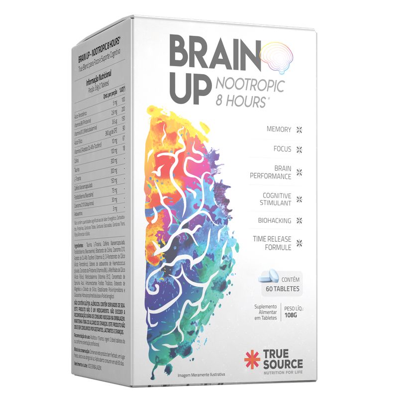 <p>O<strong> Brain Up</strong> é um Nootrópico da <strong>True Source </strong>feito com ativos naturais com foco na saúde cerebral. Possui cafeína nanoencapsulada que age com liberação gradual em até 8 horas, contribuindo para o foco e concentração que você precisa.</p> <h2>Sobre os ingredientes:</h2> <p><strong>Taurina:</strong> aminoácido que atua melhora a concentração e foco.</p> <p><strong>Cafeína nanoencapsulada:</strong> ativo natural estimulante, possui tecnologia nanoencapsulada de liberação gradual de 8 horas.</p> <h2>Sugestão de consumo:</h2> <p>Ingerir 2 tabletes ao dia, ou de acordo com orientação de nutricionista ou médico.</p> <p>Recomendado para adultos acima de 19 anos.</p> <h2>Motivos para escolher o produto:</h2> <ul> <li> <p>Sem glúten e lactose;</p> </li> <li> <p>Não possui corantes e adoçantes artificiais;</p> </li> <li> <p>Cafeína nanoencapsulada;</p> </li> <li> <p>Zero calorias;</p> </li> <li> <p>Possui coenzima Q10;</p> </li> <li> <p>300mg de taurina por dose;</p> </li> </ul> <h2>A Marca</h2> <p>A <strong>True Source</strong> é uma empresa movida pelo bem-estar, rendimento físico e pela natureza. Os produtos da True Source são elaborados com matéria-prima importada, ingredientes extraídos da natureza, proteínas limpas e sem aditivos, com isso a marca traz uma suplementação perfeita para sua dieta, com produtos de qualidade e sabor excelente. </p>