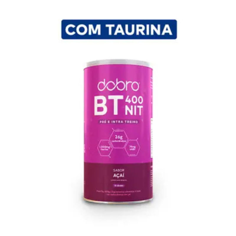 <p>O BT 400 Nitrato da Dobro sabor açaí é um suplemento alimentar elaborado com um mix de ingredientes que atuam em sinergia a favor da performance física, ele contém carboidratos, nitrato, taurina e eletrólitos em uma fórmula plant-based.</p> <h2><strong>Sugestão de consumo:</strong></h2> <p>Consumir uma dose (30g) diluída em água, antes do treino ou intra-treino, ou conforme orientação do médico ou nutricionista.</p> <h2><strong>Motivos para escolher o produto:</strong></h2> <ul> <li> <p>Não contém glúten;</p> </li> <li> <p>Fórmula plant-based;</p> </li> <li> <p>1000mg de taurina;</p> </li> <li> <p>26g de carboidratos;</p> </li> <li> <p>400mg de nitrato;</p> </li> </ul> <ul> <li> <p>Adoçado naturalmente com stévia;</p> </li> </ul> <ul> <li> <p>Pode ser usado com pré e intra-treino.</p> </li> </ul> <h2><strong>A Marca</strong></h2> <p>A Dobro foi fundada em 2018 através de um projeto de TCC da faculdade, a marca tem o propósito de nutrir relacionamentos com o mundo, buscando melhorias pessoais, sociais e ambientais. Os produtos da Dobro são desenvolvidos cuidadosamente por profissionais da saúde, atletas e clientes, combinando os benefícios de ingredientes naturais com sabor e tecnologia.</p> <p> </p>