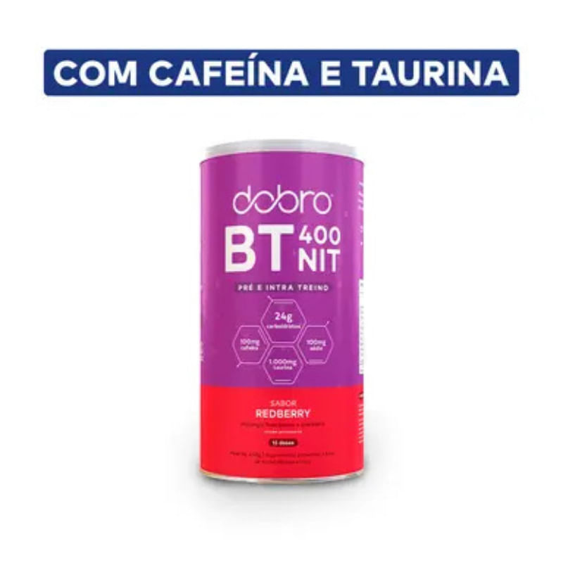 <p>O BT 400 Nitrato da Dobro sabor redberry é um suplemento alimentar elaborado com um mix de ingredientes que atuam em sinergia a favor da performance física, ele contém carboidratos, nitrato, taurina, cafeína e eletrólitos em uma fórmula plant-based.</p> <h2><strong>Sugestão de consumo:</strong></h2> <p>Consumir uma dose (30g) diluída em água, antes do treino ou intra-treino, ou conforme orientação do médico ou nutricionista.</p> <h2><strong>Motivos para escolher o produto:</strong></h2> <ul> <li> <p>Não contém glúten;</p> </li> <li> <p>Fórmula plant-based;</p> </li> <li> <p>24g de carboidratos;</p> </li> <li> <p>400mg de nitrato;</p> </li> <li> <p>100mg de cafeína;</p> </li> <li> <p>1000mg de taurina;</p> </li> <li> <p>Adoçado naturalmente com stévia;</p> </li> <li> <p>Pode ser usado com pré e intra-treino.</p> </li> </ul> <h2><strong>A Marca</strong></h2> <p>A Dobro foi fundada em 2018 através de um projeto de TCC da faculdade, a marca tem o propósito de nutrir relacionamentos com o mundo, buscando melhorias pessoais, sociais e ambientais. Os produtos da Dobro são desenvolvidos cuidadosamente por profissionais da saúde, atletas e clientes, combinando os benefícios de ingredientes naturais com sabor e tecnologia.</p> <p> </p>