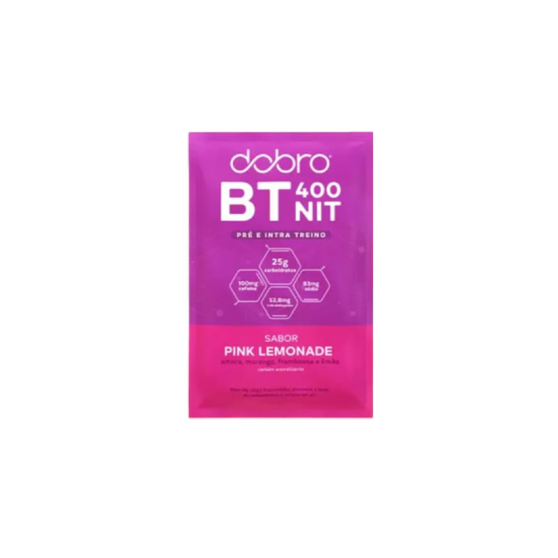 <p>O BT 400 Nitrato da Dobro sabor pink lemonade é um suplemento alimentar elaborado com um mix de ingredientes que atuam em sinergia a favor da performance física, ele contém carboidratos, nitrato, cafeína, citrulina e eletrólitos em uma fórmula plant-based.</p> <h2><strong>Sugestão de consumo:</strong></h2> <p>Consumir um sachê (30g) diluído em água, antes do treino ou intra-treino, ou conforme orientação do médico ou nutricionista.</p> <h2><strong>Motivos para escolher o produto:</strong></h2> <ul> <li> <p>Não contém glúten;</p> </li> <li> <p>Versão sachê: prática para transportar;</p> </li> <li> <p>Dose única; </p> </li> <li> <p>Fórmula plant-based;</p> </li> <li> <p>25g de carboidratos;</p> </li> <li> <p>400mg de nitrato;</p> </li> <li> <p>100mg de cafeína;</p> </li> <li> <p>Contém citrulina;</p> </li> <li> <p>Adoçado naturalmente com stévia;</p> </li> <li> <p>Pode ser usado com pré e intra-treino.</p> </li> </ul> <h2><strong>A Marca</strong></h2> <p>A Dobro foi fundada em 2018 através de um projeto de TCC da faculdade, a marca tem o propósito de nutrir relacionamentos com o mundo, buscando melhorias pessoais, sociais e ambientais. Os produtos da Dobro são desenvolvidos cuidadosamente por profissionais da saúde, atletas e clientes, combinando os benefícios de ingredientes naturais com sabor e tecnologia.</p> <p> </p>