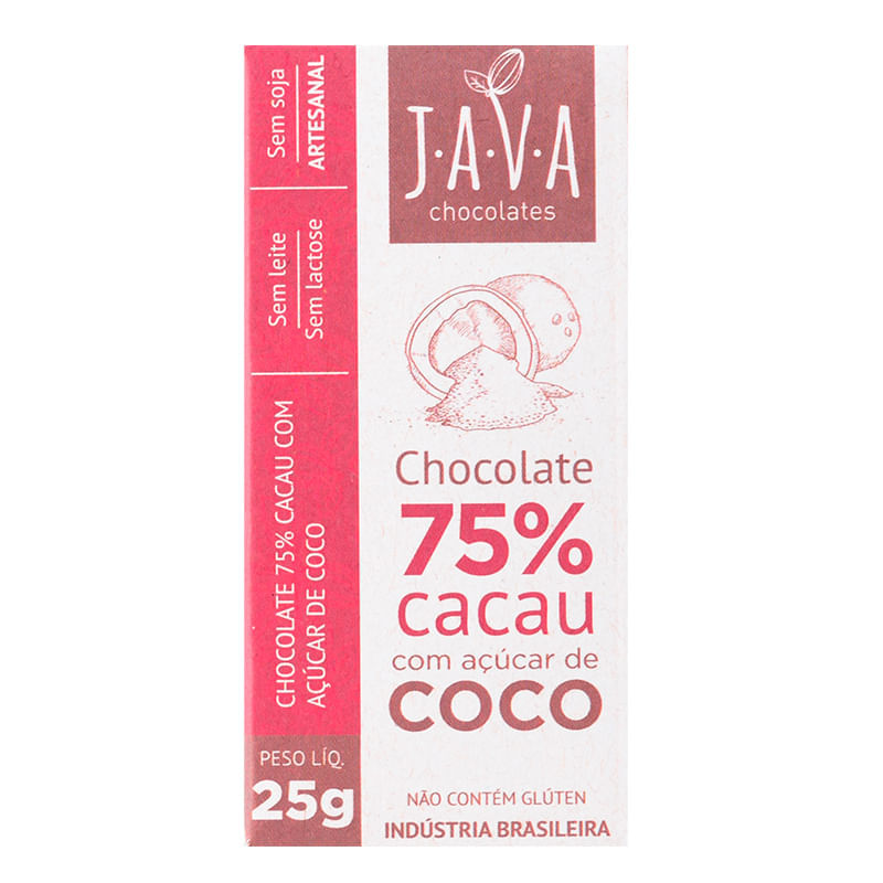 <p>O Chocolate 75% Cacau com Açúcar de Coco 25g, da Java Chocolate é uma junção do cacau da Amazônia especial ao açúcar de coco e o resultado ficou uma delícia! Apresenta notas de caramelo, baixa acidez, adstringência, além de textura aveludada e agradável derretimento.</p>