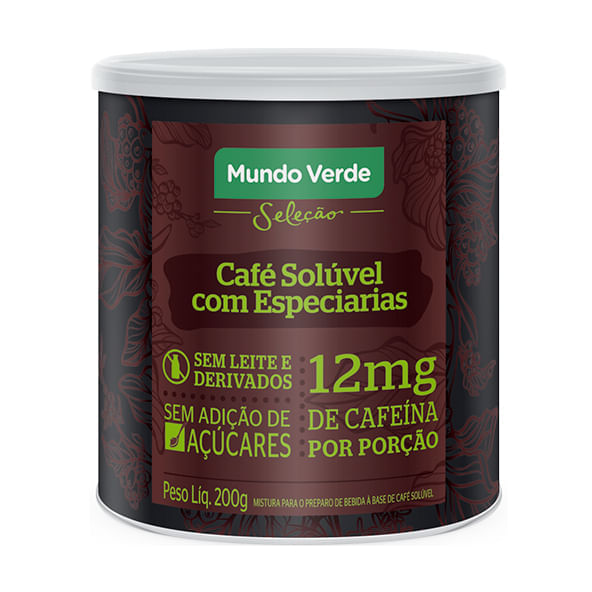 <p>Informações técnicas do produto:<br>O Café solúvel com especiarias Mundo Verde Seleção possui em sua composição o cacau em pó e especiarias como gengibre, pimenta e canela, além de serem fonte de antioxidantes.<br><br>A fórmula solúvel confere praticidade para você preparar facilmente a qualquer hora, ainda é livre de açúcar, glúten ou lactose.<br><br>Recomendação de consumo:<br>Dilua 2,5g (1/2 dosador) do produto em 50ml de água quente ou leite quente de acordo com sua preferência. Consuma conforme indicação de um nutricionista e/ou médico.<br><br>Motivos para escolher esse produto?<br>Fornece 12mg de cafeína por porção<br>Sem adição de açúcar<br>Sem glúten<br>Sem leite e derivados<br>Adoçado com Stevia<br>Informações sobre a marca: <br>A Mundo Verde Seleção é uma linha de produtos para quem quer ter uma vida mais saudável e gostosa. A marca quer ajudar a colocar essas escolhas em prática. A paixão e conhecimento pelos alimentos, nutrientes, aromas e sabores permitem a seleção das melhores opções saudáveis para qualquer ocasião. Conheça a linha completa Mundo Verde Seleção, com inúmeros produtos saudáveis e gostosos para facilitar seu dia a dia.</p>